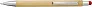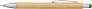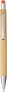 Bamboo ballpen with plastic tip and top, including rubber tip for capacitive screens. The clip is metal. Blue ink.