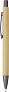 Bamboo ballpen with plastic tip and top. The clip is metal. Blue ink.