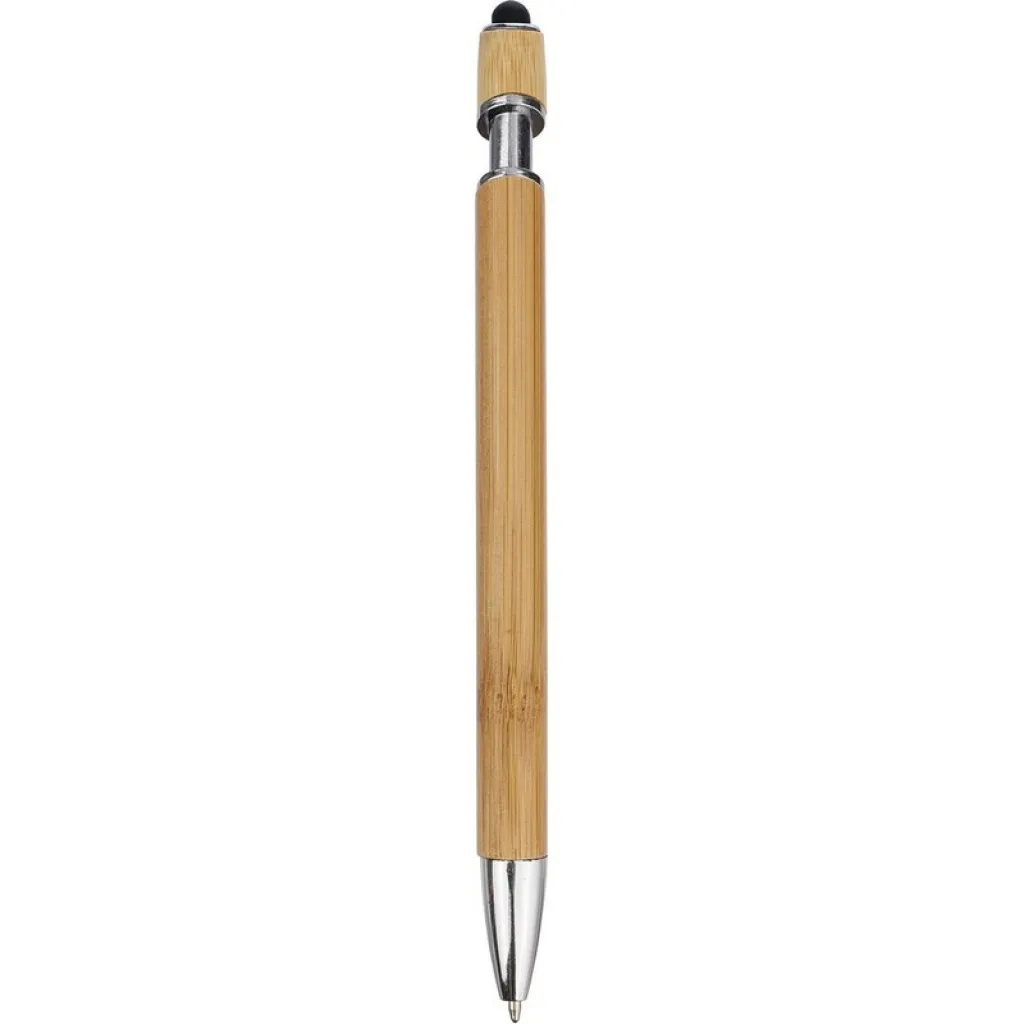 Ball pen, touch pen with chrome metal details, stylus tip enables touch screen operation, clip for easy hanging on a pocket or notebook cover, writes in blue, writing length approx. 800 m, product made from bamboo, plastic and metal