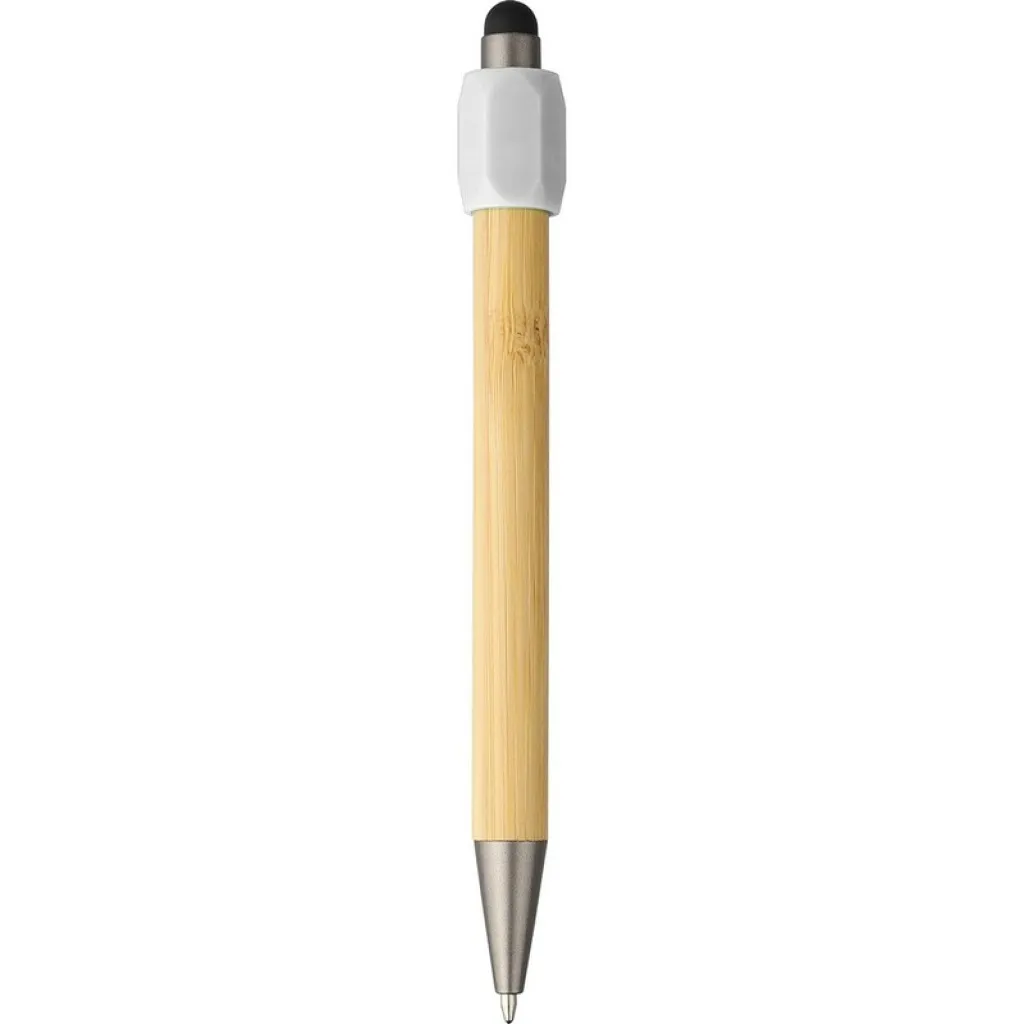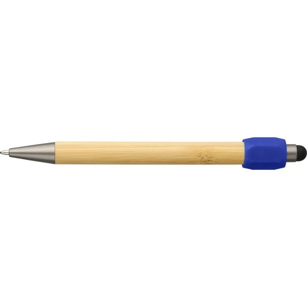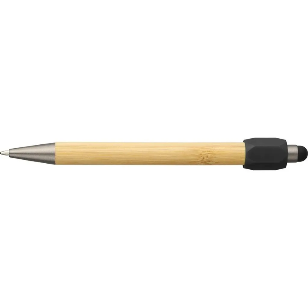 Bamboo ballpen with a recycled ABS spinner function, a black stylus tip on the pusher, features a push mechanism, 1.0 mm nib size, blue ink with an approximate writing length of 800 meters, includes recycled ABS icon on a product