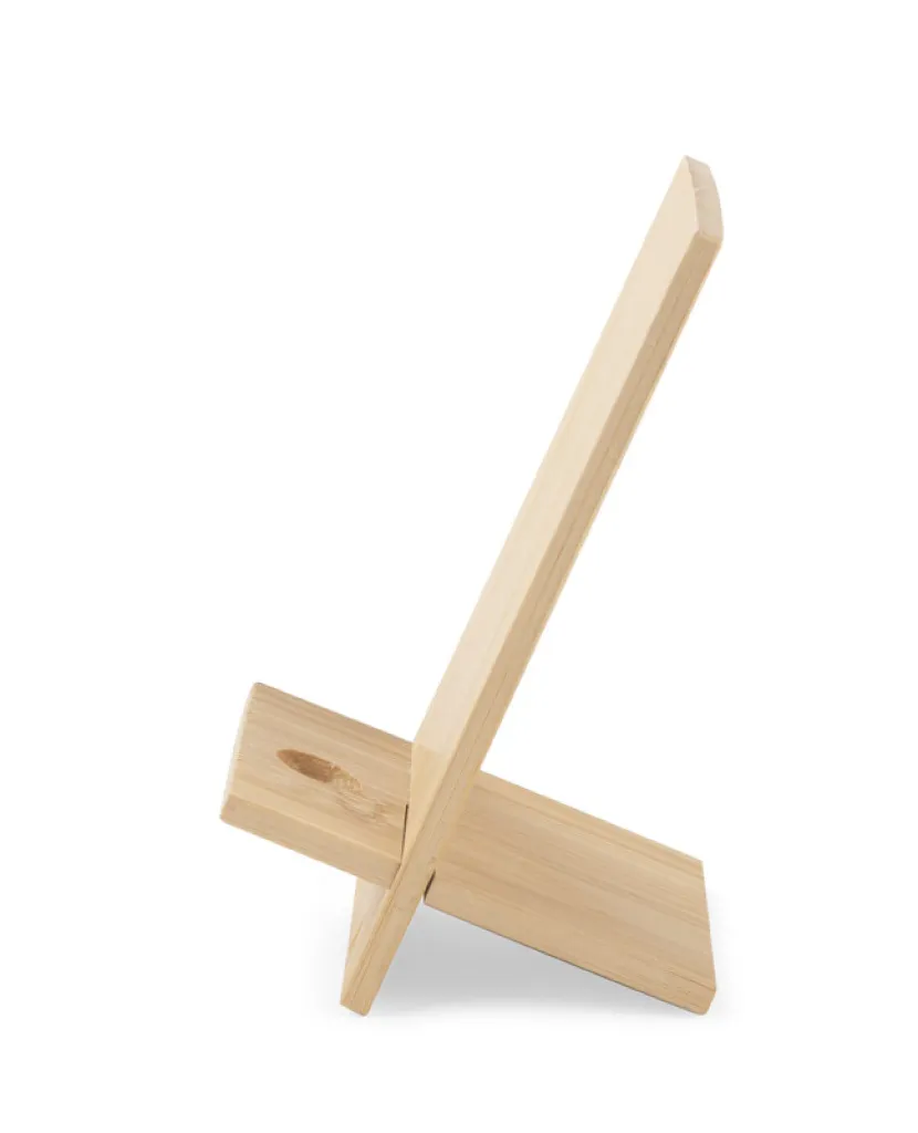 RAGA is a practical phone stand made entirely of ecological material - natural bamboo. Provides a stable base for phones and other mobile devices. The cable hole will allow you to easily charge the device while using the stand. A product for self-assembly by conecting two bamboo tiles. The stand is packed in a brown paper envelope with an infographic - assembly instructions.