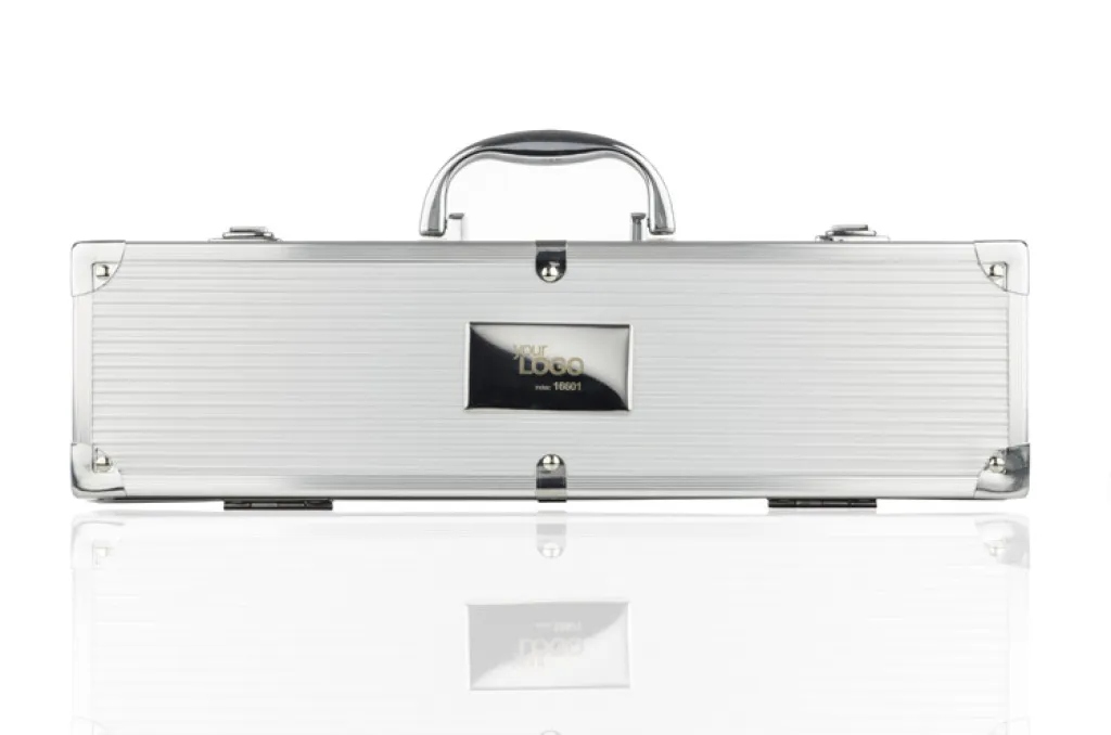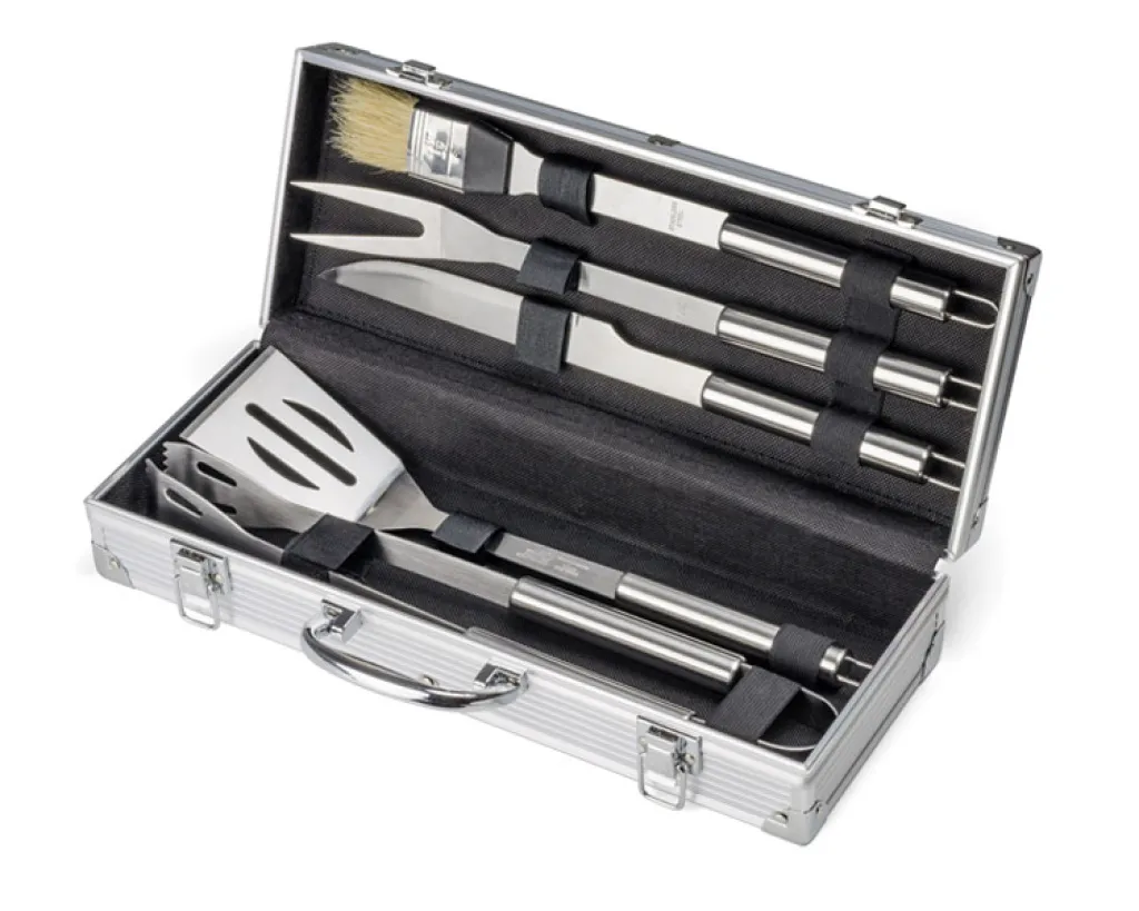 Barbecue set in a case: tongs, spatula, knife, fork and brush. The plate is attached separately.