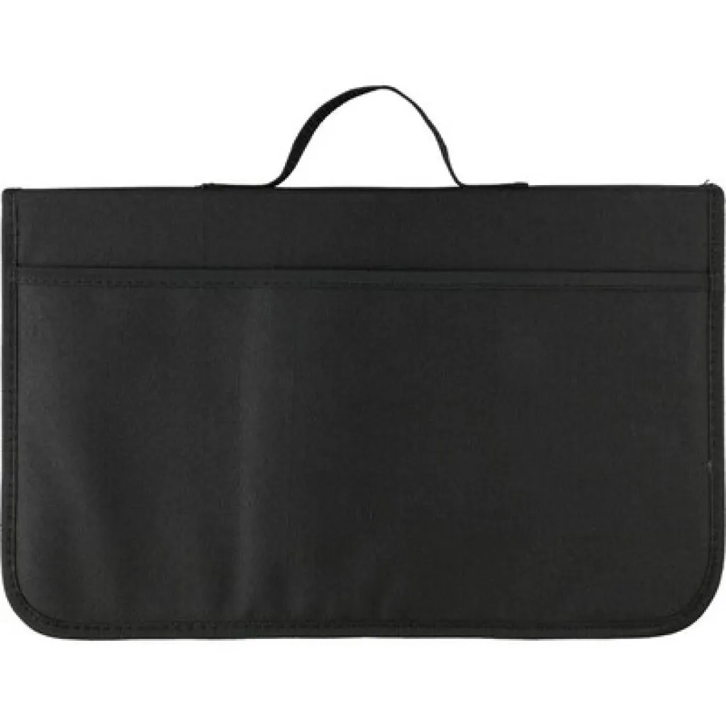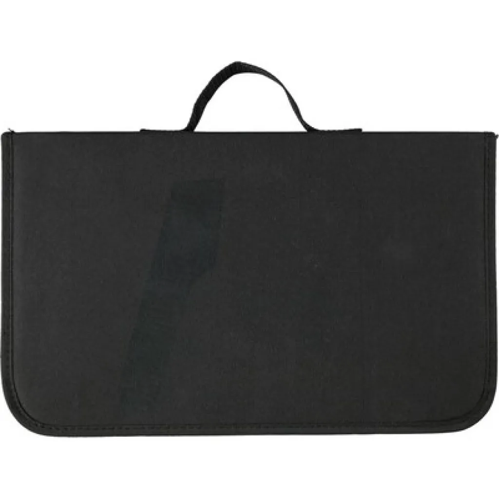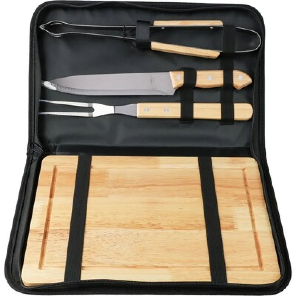 Barbecue set packed in a zippered bag with a carrying handle, open front pocket, the set includes tongs, knife, fork and wooden cutting board, product made of stainless steel, wood and polyester