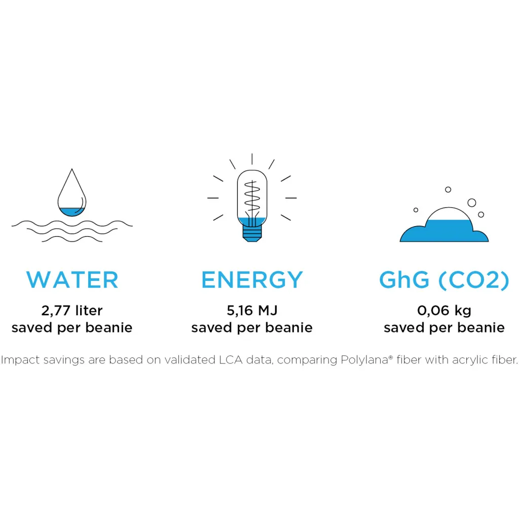 Sustainable promotional headwear. Single layer beanie with double folded edge. Branded loop label. Polylana® fiber is the low-impact alternative to 100% acrylic and wool fibers, saving water, energy and reducing CO2 emission during the production and dyeing process.
