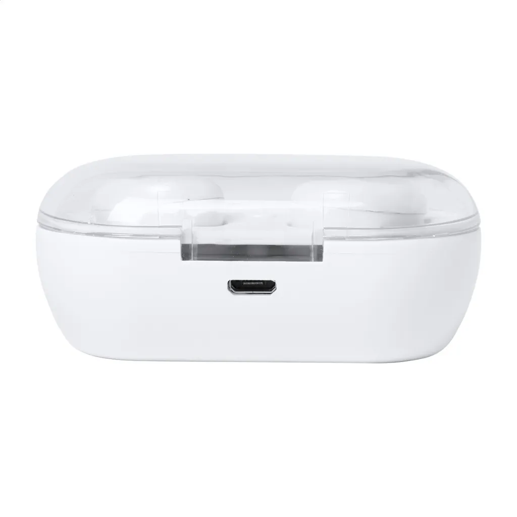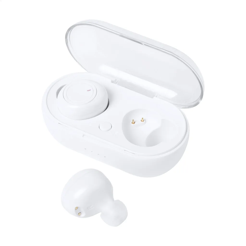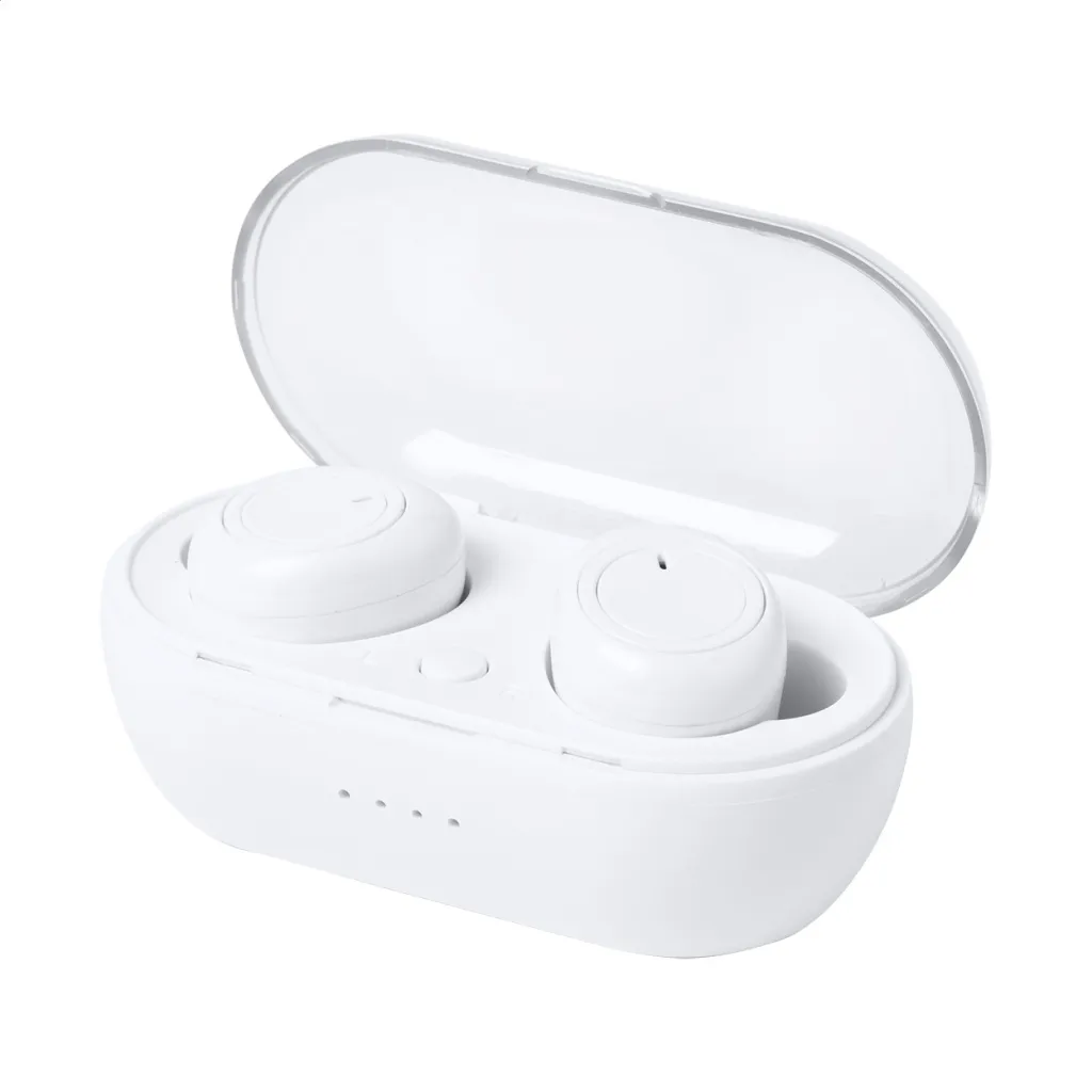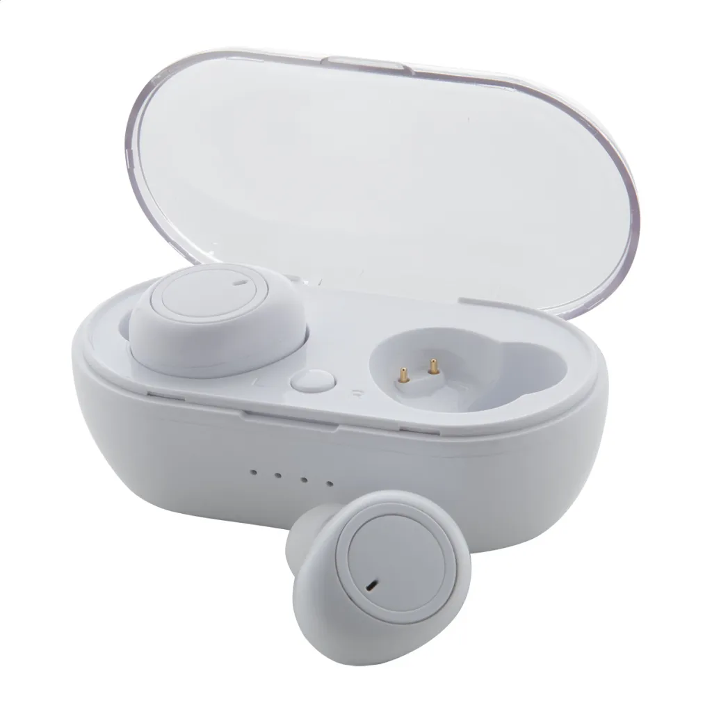 Wireless bluetooth earphones with hands-free call function in plastic charger case. Including USB charger cable.