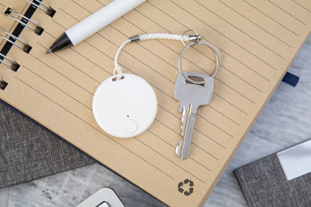 Bluetooth anti-lost key finder device with camera shutter, in round shaped plastic housing. With string and metal keyring. With button cell battery. Operates with a free iOS / Android App.