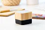 Bluetooth speaker in bamboo housing with rubber bottom part and built-in rechargeable battery. With hands-free call and micro SD player functions. Including USB charger cable.