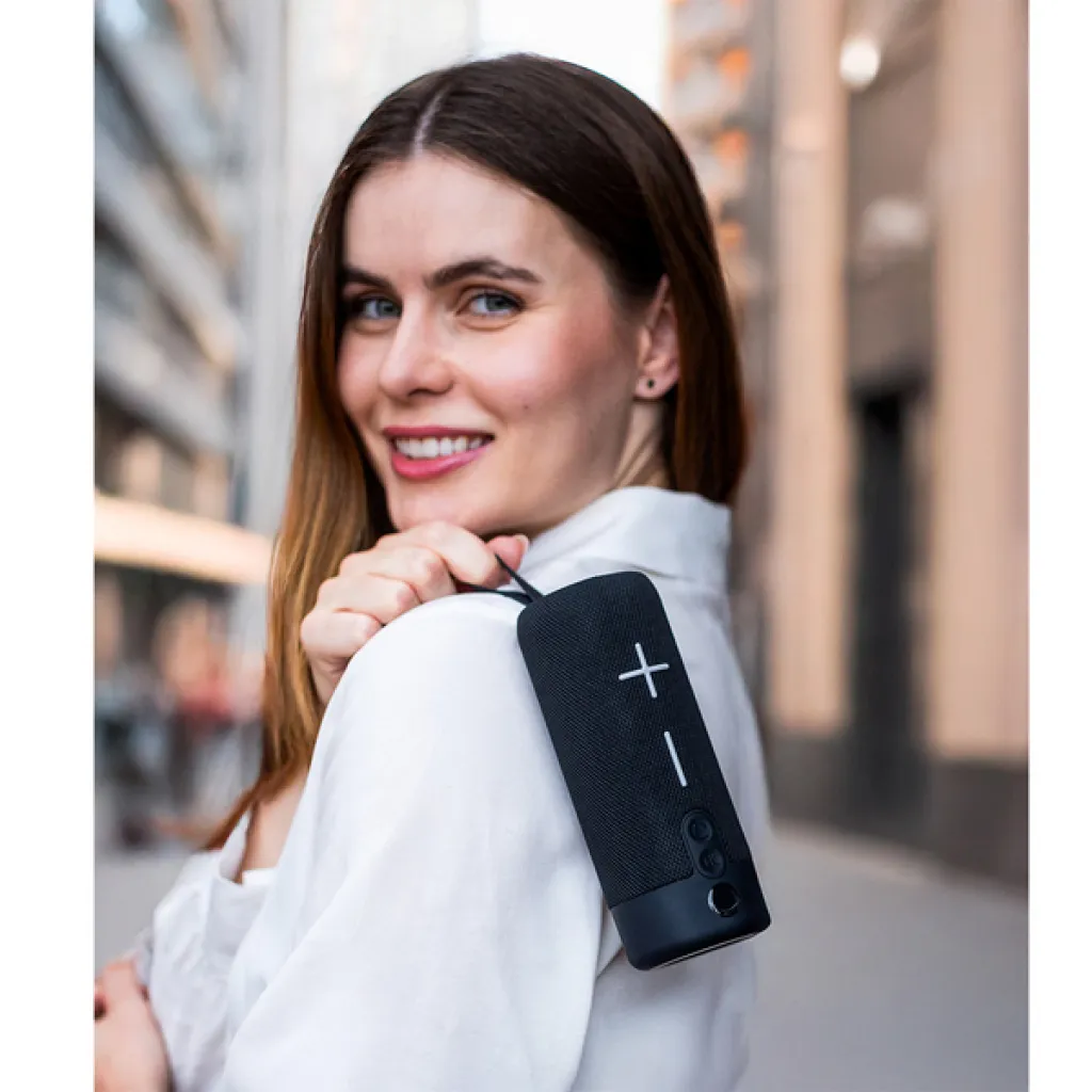 Stylish Bluetooth V5.0 speaker for the highest sound quality. Built-in FM radio and audio playback controls. Equipped with hands-free call answering function, ports for a micro SD card and USB. Output power: 5W * 2. Built-in lithium-ion battery with a capacity of 1200 mAh. Frequency response: 120Hz-80KHz. Charging: DC 5V micro USB (cable included). Charging time: 1.5 to 2 hours. Playing time: up to 2 hours. Transmission range: 10m. The loudspeaker grille is finished with a melange textile material.