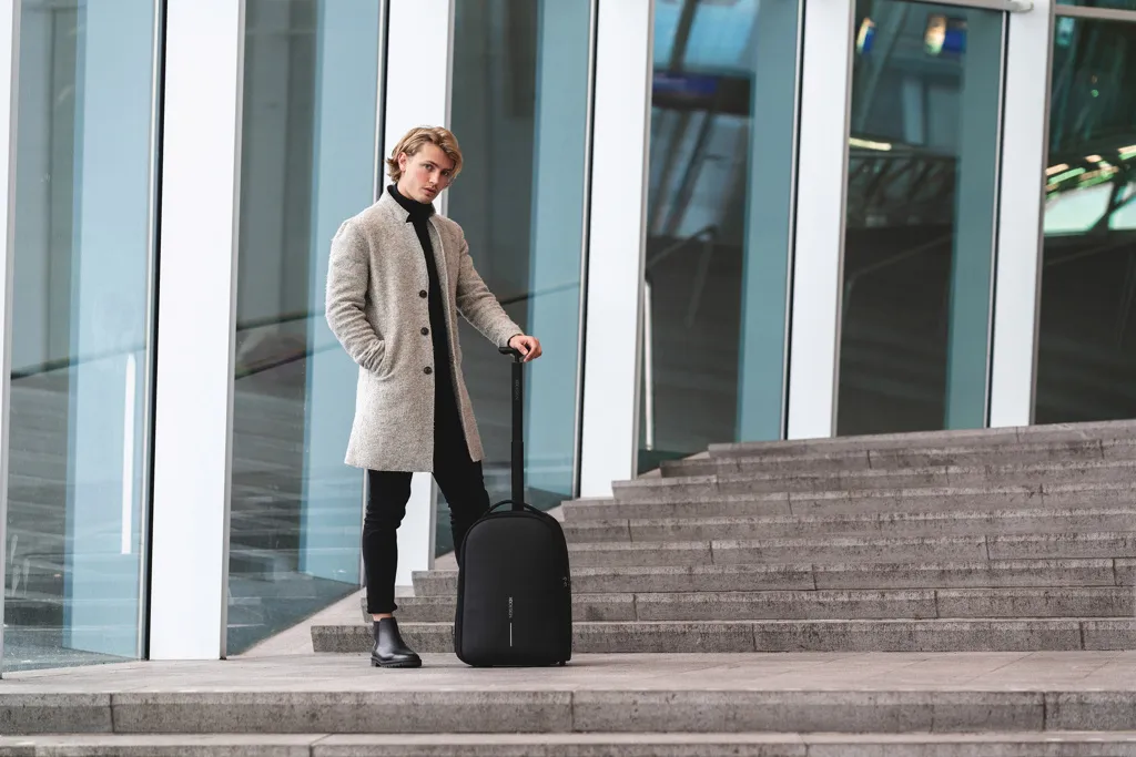 Convenient as a trolley and practical as a backpack. The Bobby backpack trolley is your ideal travel companion for short trips or daily commute. Easily transform it from a backpack into a trolley by storing the shoulder straps in the back panel and releasing the handle. When switching into backpack mode, you can hide the handle and wrap the backpack around the wheels, keeping your back clean. The Bobby backpack trolley keeps you safe and connected with the well-known Bobby anti-theft features combined with a TSA® lock. Inside, you will find separate compartments for clothes and business devices with a quick access laptop pocket that opens at a 30-degree angle and fits laptops up to 17”. In addition, you have a water bottle pocket and an RFID protected pocket protecting your identity. The Bobby backpack trolley is made from recycled materials and can be taken on board aircrafts as carry-on luggage. Registered design®