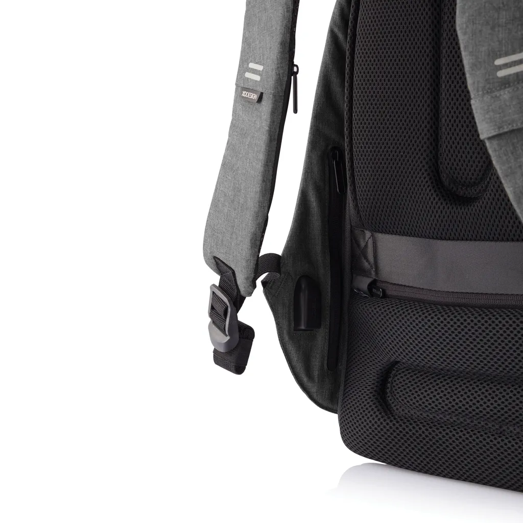 The Bobby Hero line is our new generation of anti-theft backpacks. This new model will help you to move safe, carefree and organized. Key features such as cut-proof protection, hidden zipper closures & pockets will keep your belongings safe during your commutes. Bobby is also the most convenient backpack with features such as an integrated USB charging port, water-repellent fabric, illuminating safety strips and a luggage strap. On the inside there are padded compartments for a 15,6” laptop, tablet up to 12,9” and all your other belongings. The backpack is made from rPET, recycled PET bottles. Registered design®