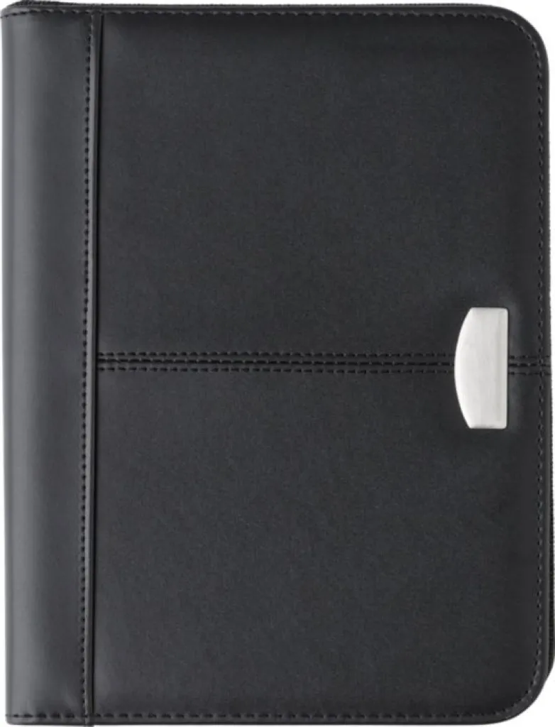Bonded leather zipped conference folder (approx. A5), with a notepad with 25 pages, different pockets, and an elasticated pen loop (pen not included).