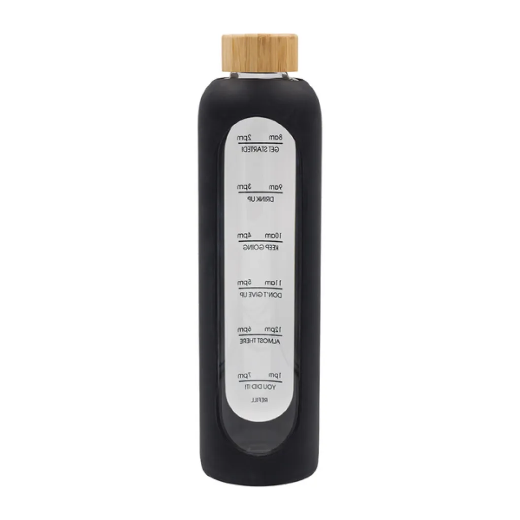 1100 ml airtight, borosilicate glass bottle with black silicone case and bamboo lid.