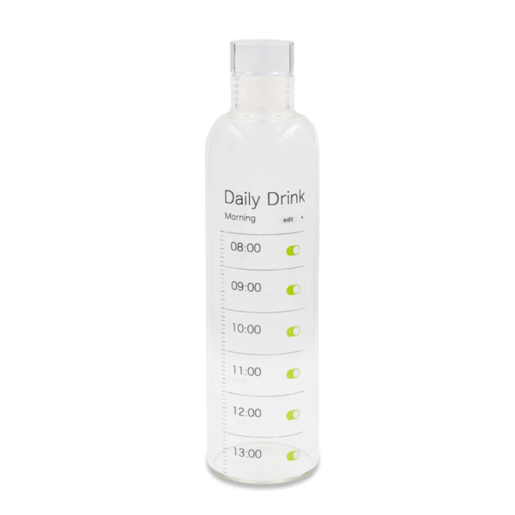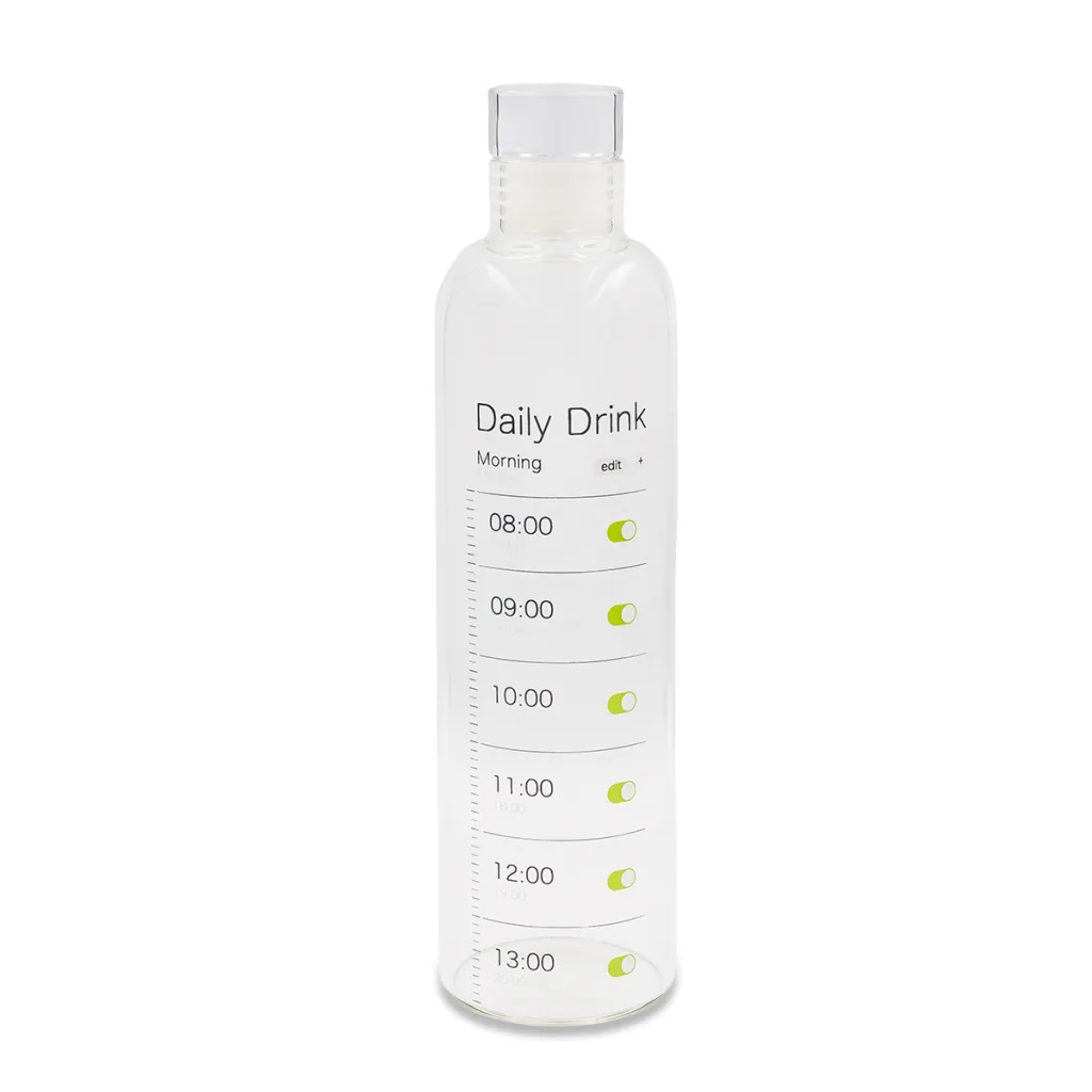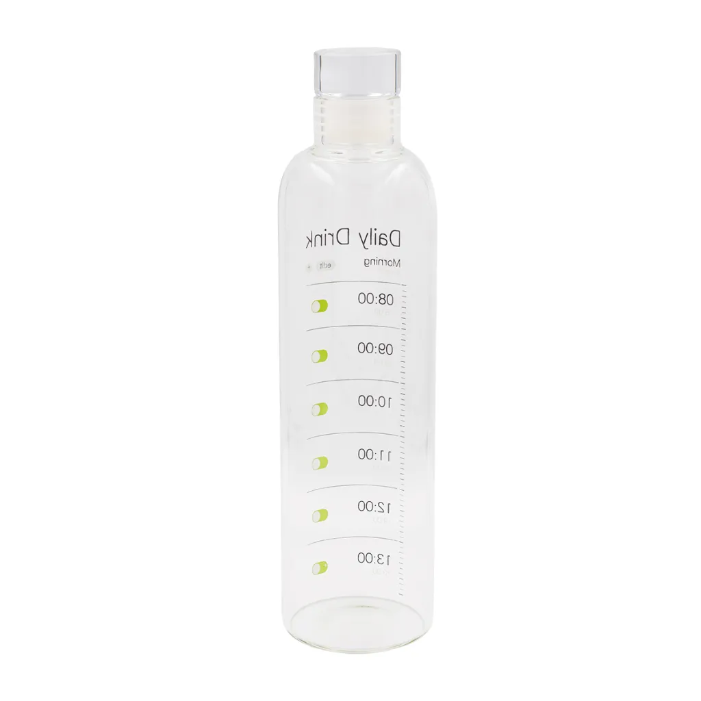 Borosilicate glass bottle with motivational print, closed with a tight glass stopper. Capacity: 550ml.