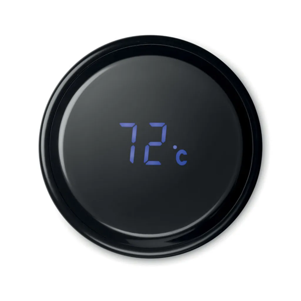 Double wall stainless steel insulating vacuum bottle. It has an LED touch thermometer incorporated in to the top of the lid and tea infuser inside. 1 CR 2450 battery included. Leakproof. Capacity: 450 ml.