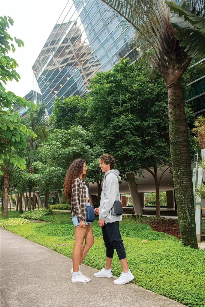 The Boxy Sling is a versatile cross body bag, designed to carry everyday essentials. The pack can be worn around the neck, over the shoulder or around the waist. It has enough capacity to hold a cellphone, wallet or purse, passport, notebook and various other small items. The hidden rear pocket is perfect for discreetly storing cash, cards or other valuable items. The Boxy Sling has a unique hidden water bottle pocket that can stay tucked away when not in use. Made from R-pet fabric with the AWARE™ tracer. With AWARE™, the use of genuine recycled fabric is guaranteed. 27% recycled content.