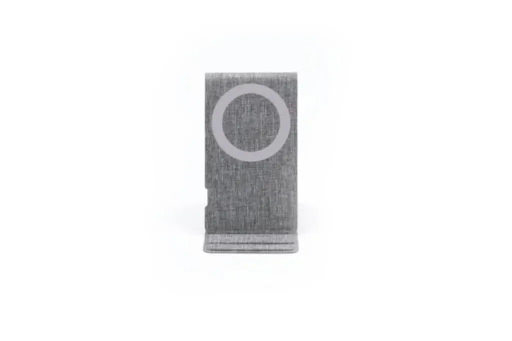 The Ascend Charge Eco is a sustainable phone and tablet holder made from RPET, certified by the Recycled Claim Standard (RCS). It features 15W fast wireless charging, is MagSafe compatible, and includes a silicon MagSafe sticker. With an adjustable angle and foldable design, it’s a practical, eco-friendly accessory for any workspace. Patent protected for unique functionality.
