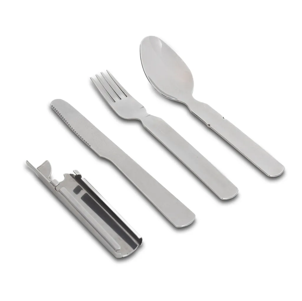 4 pieces, practical stainless steel cutlery set in the pouch. Perfect for survival trips or camping. The set includes cutlery: knife, fork, spoon, can opener and bottle opener. Compact design which slides together for easy storage.