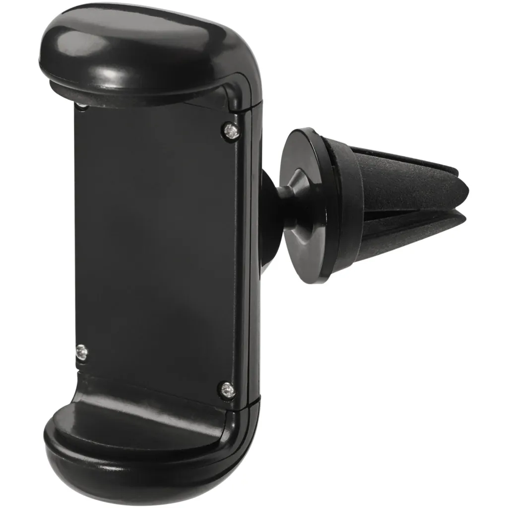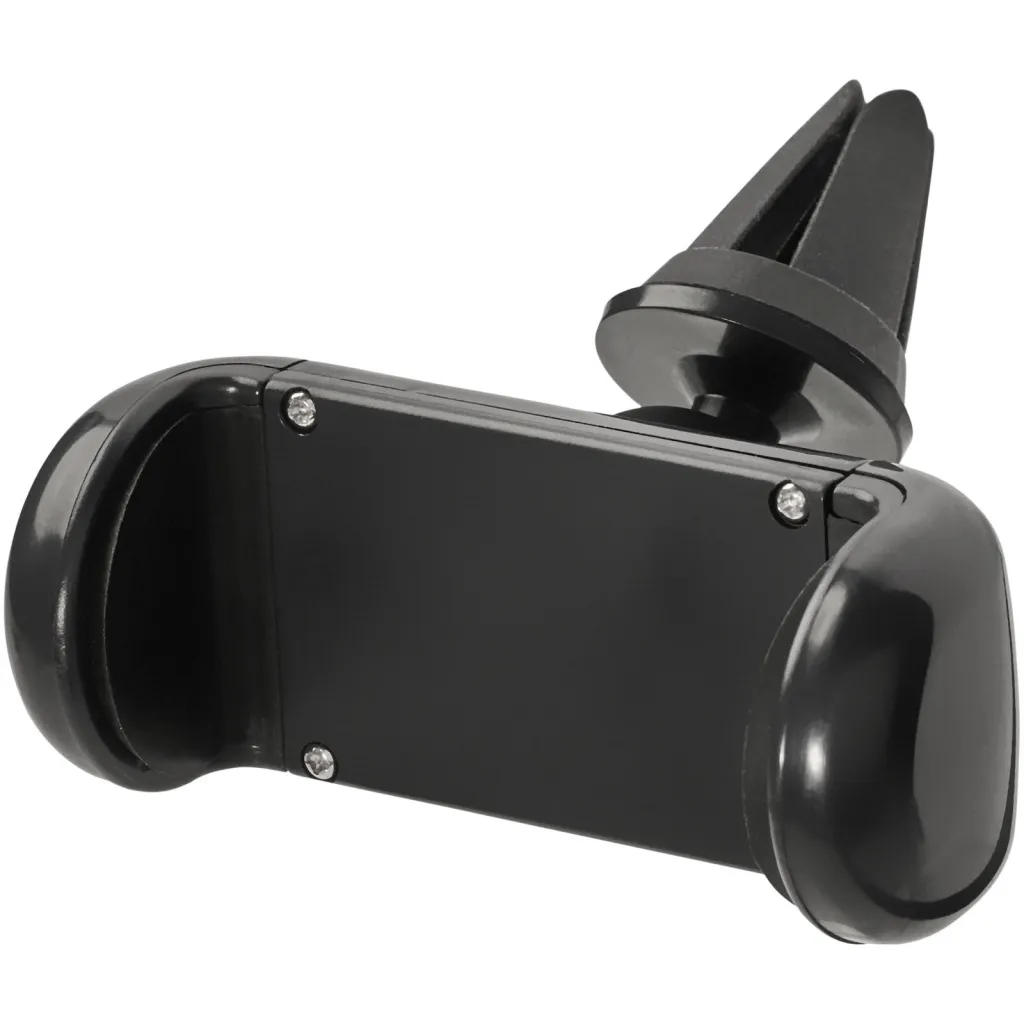 Phone holder that fits into the dashboard air vent in a car, and keeps a mobile phone in a convenient and secure position. Compatible with all phones. It has 360 degree rotation with a bilateral opening.