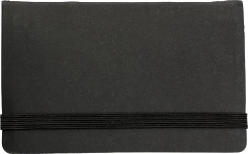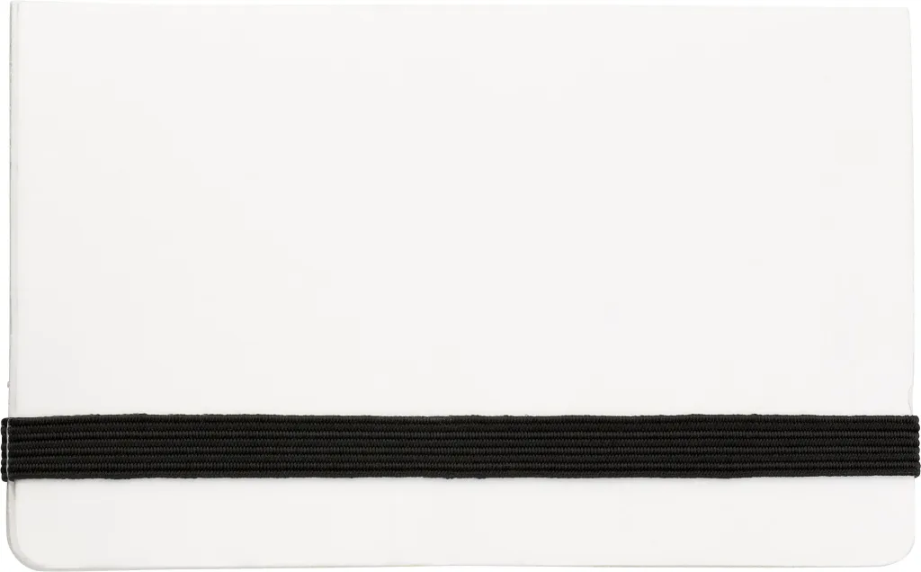 Cardboard booklet with 150 sticky notes and inside pocket for business cards. Elastic band over the cover.