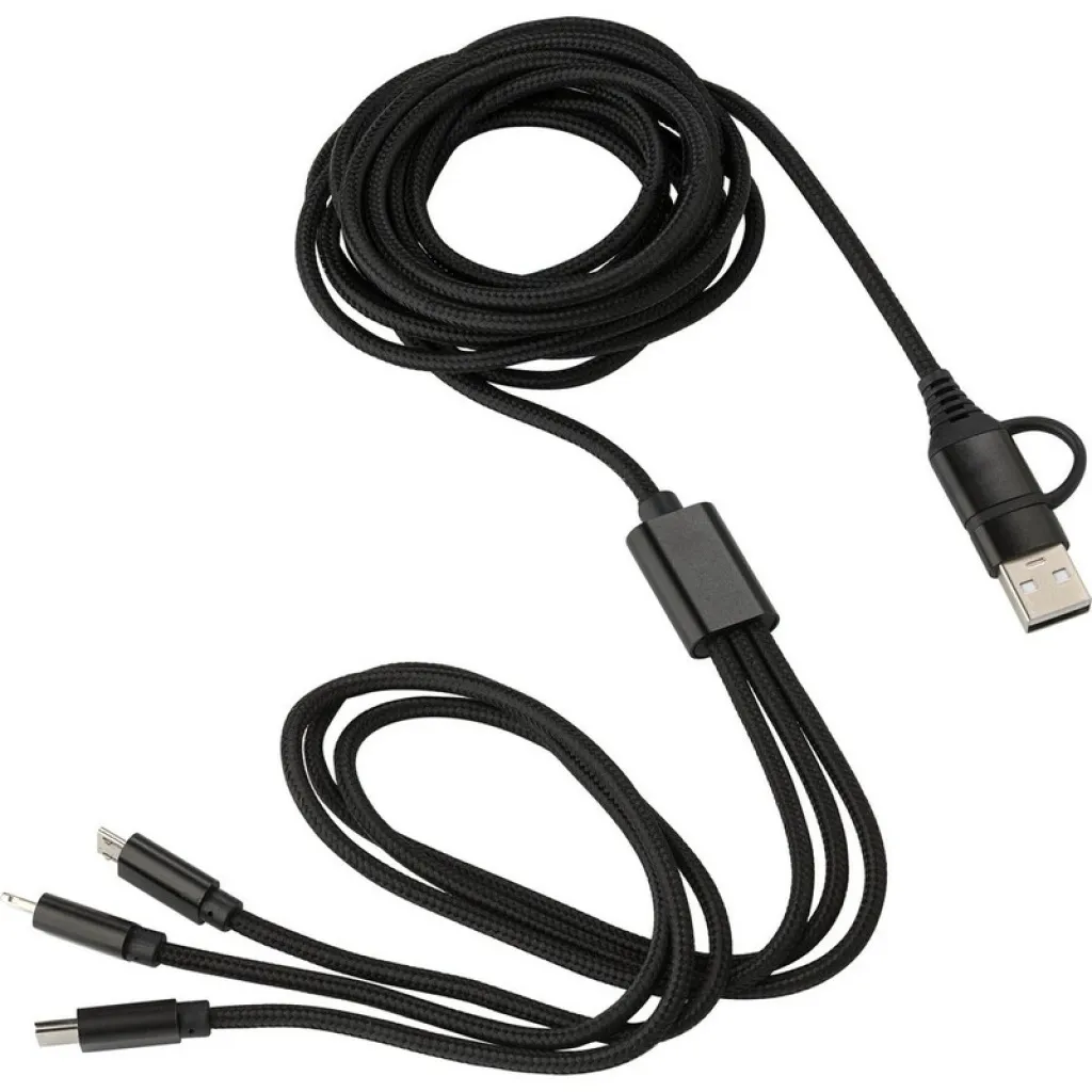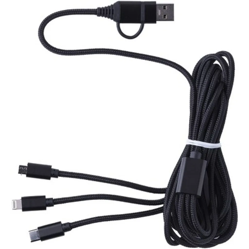 Charging cable with 4 plugs: USB, USB C, micro USB and compatible with iOS devices, 290 cm length.