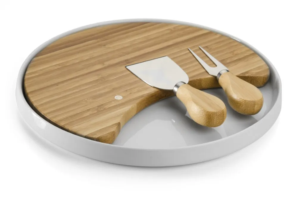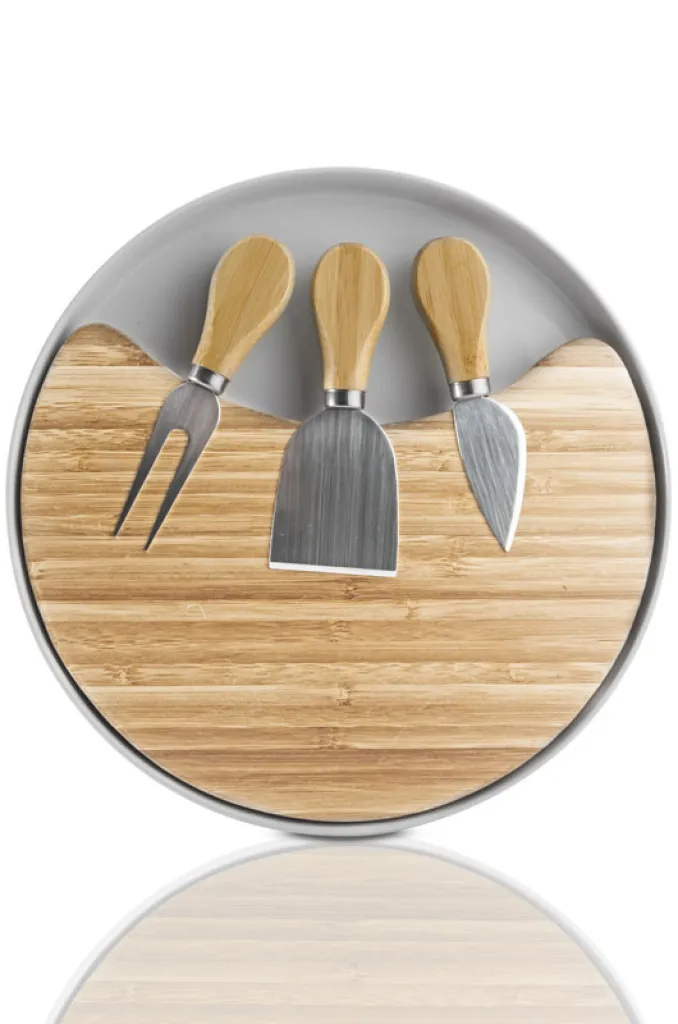 The CHEDDAR cheese board is an elegant set for serving cheese. The CHEDDAR set is a must for meetings over a glass of wine. It includes a bamboo board, a ceramic stand and three knives.