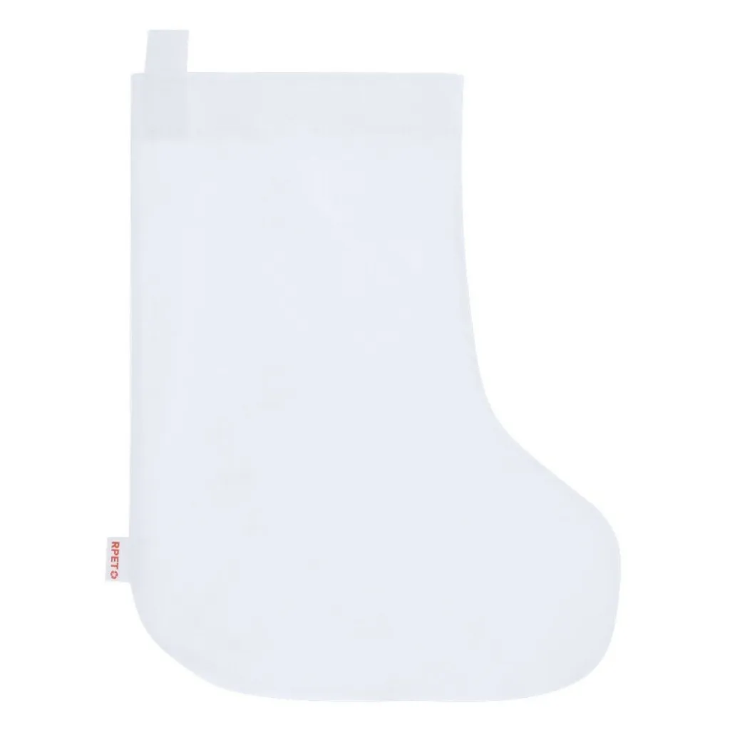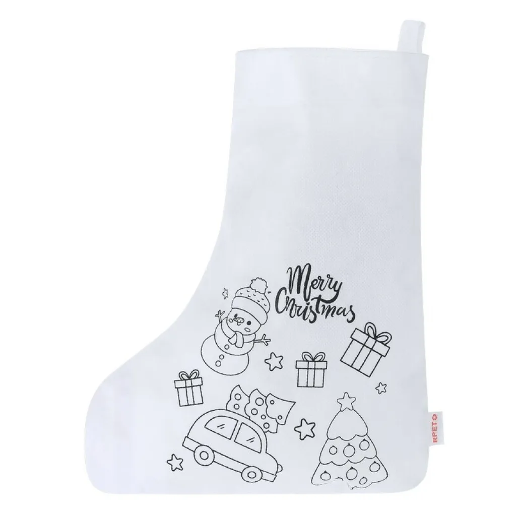 Christmas sock for colouring, Christmas-themed line art on the front, 5 crayons included, comes with a ribbon for hanging, includes RPET icon on tag, product made from non-woven RPET.