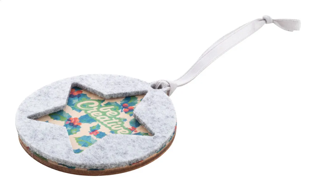 Custom made, dual-layer RPET felt and birch plywood Christmas tree ornament with full silver ribbon and die-cut Christmas design on the top layer. Price Price includes UV LED printing on the bottom layer. MOQ: 100 pcs.