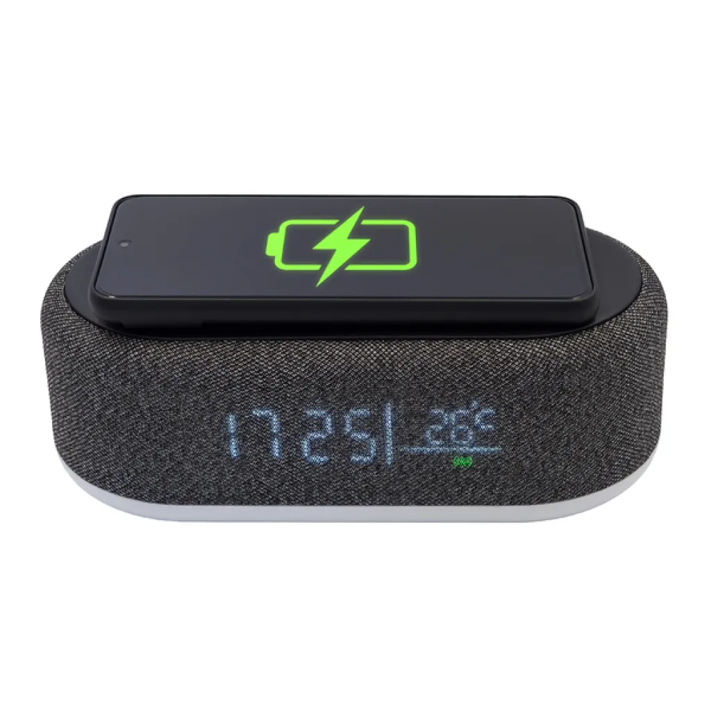 Wirelss charger with display, powered by USB cable (included). Device functions: clock, date, temperature, alarm clock, wireless charging (15W), 3 levels of LED brightness adjustment.