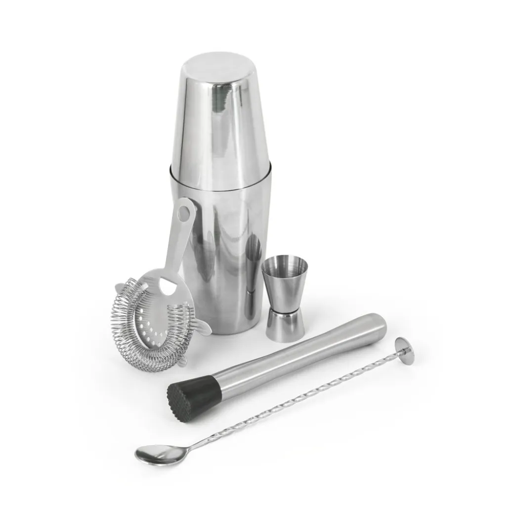 6-piece stainless steel cocktail set: a shaker (600 + 450 ml), a measuring cup (30 ml), a spoon, a pestle and a strainer. Includes a non-woven pouch. Supplied in a gift box. Box dimensions: 98 x 98 x 290 mm