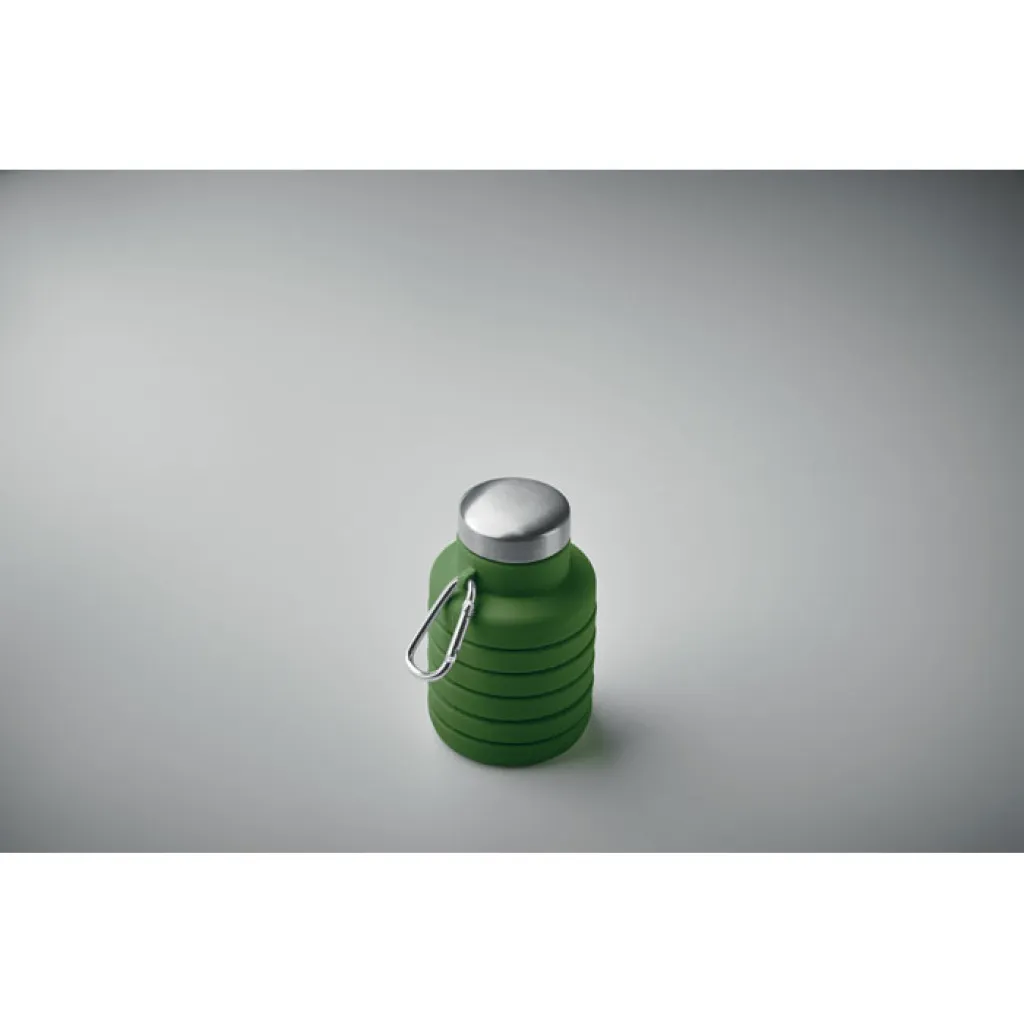 Collapsible silicone bottle with stainless steel lid and aluminium carabiner. The carabiner is not for climbing (non-professional use). Capacity: 500 ml.