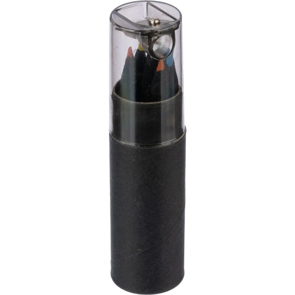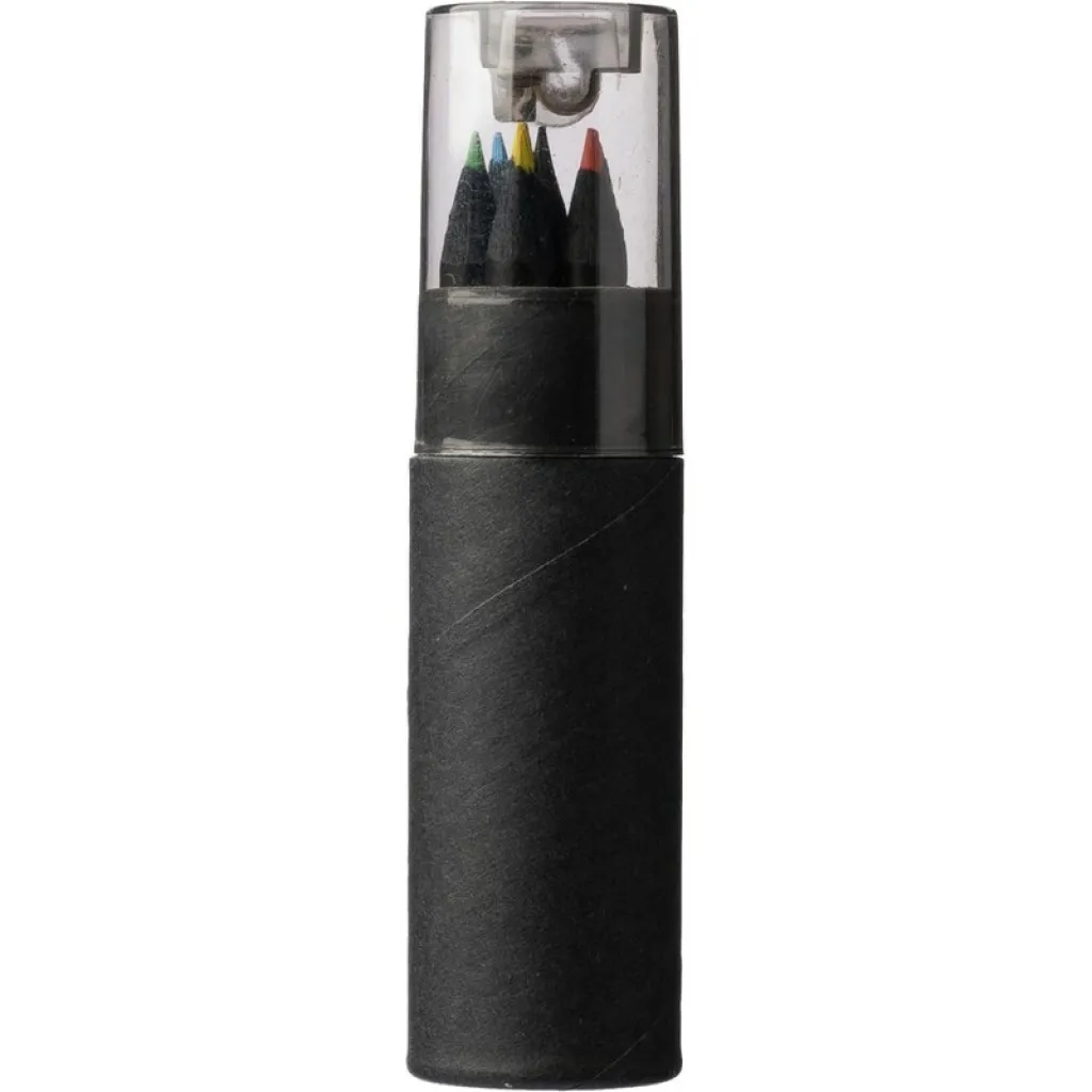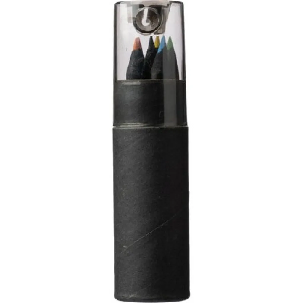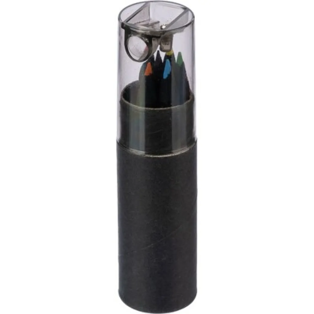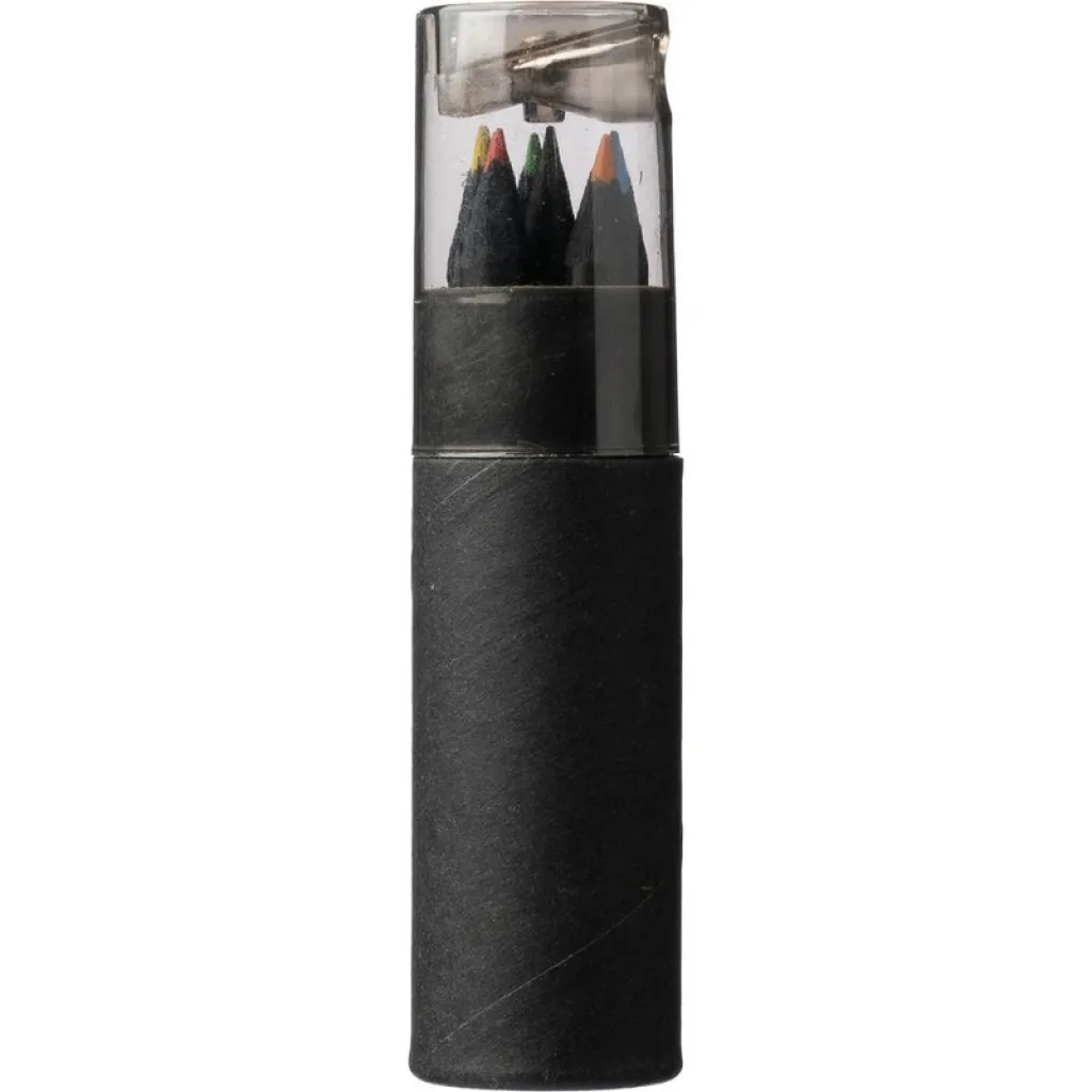 Set of 6 colour pencils with a decorative black shaft, packed in a round box and plastic cap with a built-in sharpener, making it easier to store and harder to damage the pencils, product made from recycled cardboard and ABS.