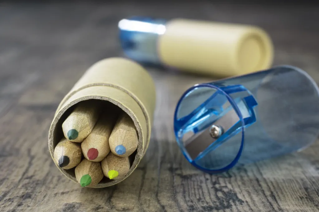 Wooden 6-colour pencils. Packed into a paper tube with plastic closure. There is placed a sharpener in this closure. Logo might be imprinted on the tube.