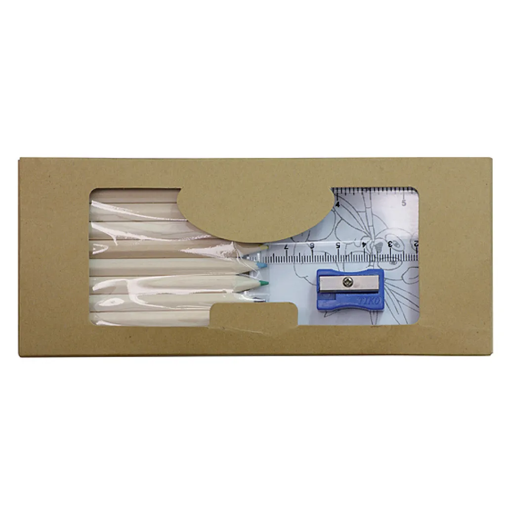 Young artist's set including colouring book, 10 wooden colour pencils, ruler and sharpener. Logo might be imprinted on a carton.