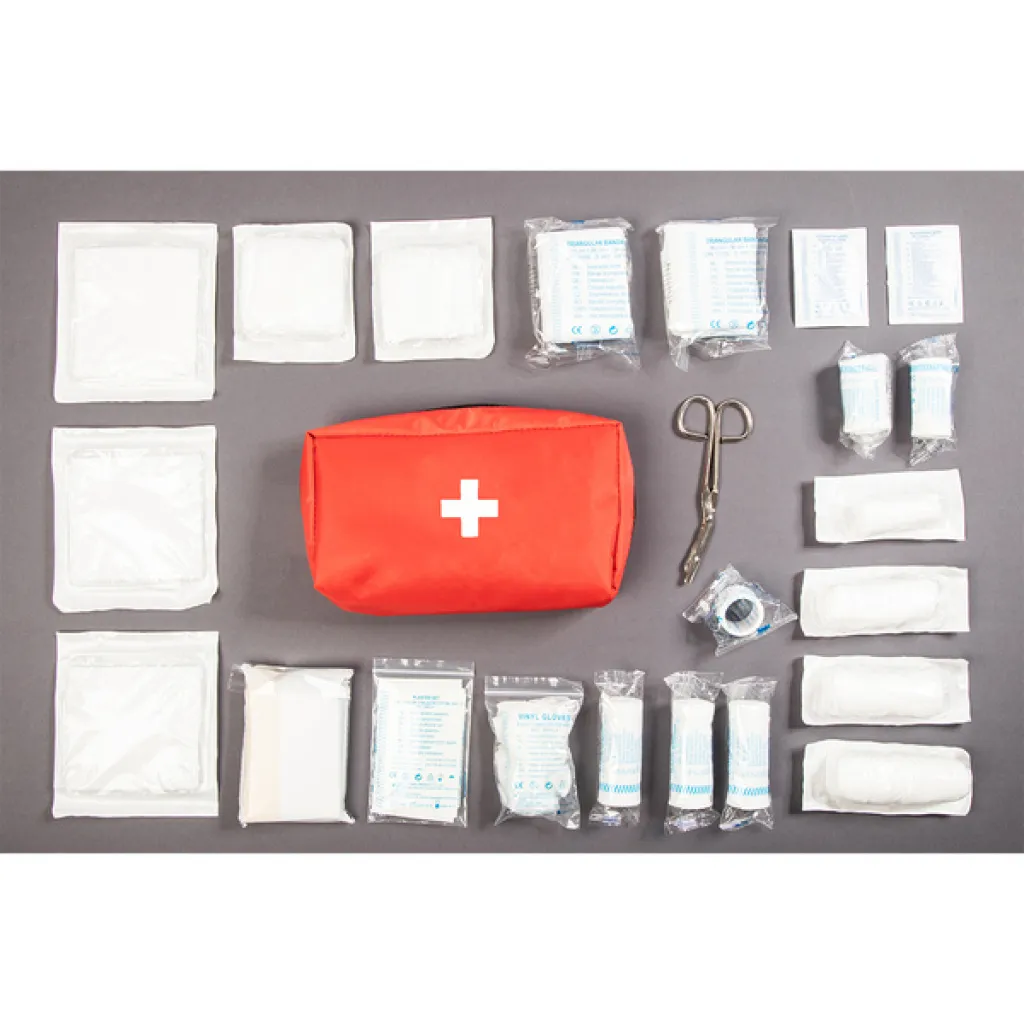 Car first- aid kit containing 40 elements. It contains: 1. 1 sticking plaster bandage 2,5 cm x 5 m, 2. 4 sticking plasters 10 x 6 cm, 3. 2 sticking plasters 3,8 x 7.2 cm, 4. 2 sticking plasters 12 x 2 cm, 5. 2 sticking plasters 7,2 x 1.9 cm, 6. 4 sticking plasters 7,6 x 2,5 cm, 7. 1 bandage 6 cm, 8. 2 bandages 8 cm, 9. 1 bandage 10 cm, 10. triangular bandage 40 x 60 cm, 11. triangular bandage 60 x 80 cm, 12. 4 pairs of disposable gloves, 13. 2 elastic bandages 5 cm, 14. 3 elastic bandages 8 cm, 15. first aid blanket 160 cm x 210 cm, 16. 3 sterile compresses, 17. 2 triangular bandages 136 x 96 x 96 cm, 18. scissors, 19. 2 wet wipes 20 x 10 cm and use instruction. Product in compliance with 93/42/EEC Directive.