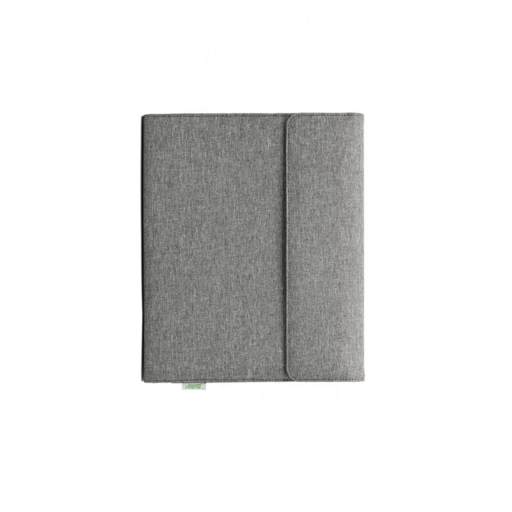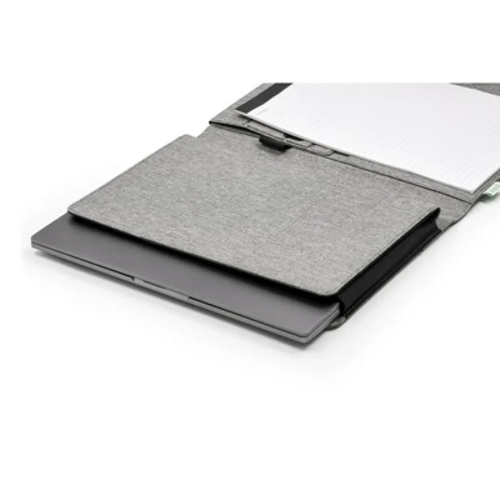 The Noty Folio portfolio, crafted from recycled PET bottles and paper, is a premium business folio perfect for busy, organized professionals. It includes space for an A4 notepad, a tablet/laptop pocket (up to 13”), and compartments for essentials like business cards. This comprehensive folio has a magnetic closure, hardcover, and fold-out desk organizer. Ideal for frequent commuters and professionals on the go.