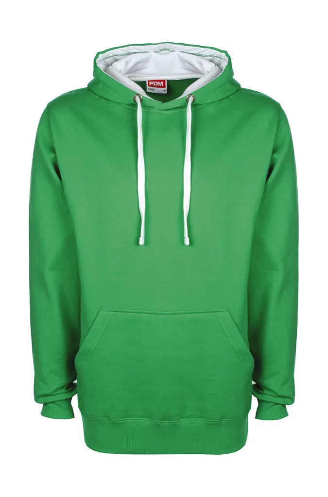 ·300 g/m² ·80% Cotton, 20% Polyester ·Sport Grey: 70% Cotton, 30% Polyester ·100% cotton outer face for better print and softer handfeel ·Unisex style ·Reactive dyed ·Hood lining in contrast colour single jersey ·Contrast colour drawcords ·Set-in sleeves ·Front pouch pocket ·Twin needle stitching ·Elastane ribbed welt and cuffs.
