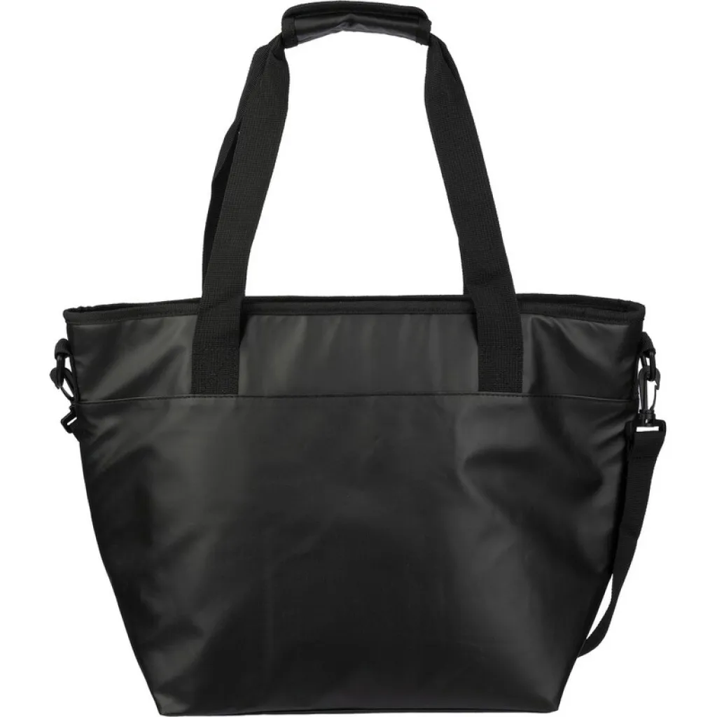 Cooler bag, features two carrying handles with hook and loop closure, an adjustable shoulder strap for easier carrying, zippered front pocket, waterproof interior, helps to keep food and beverages fresh for longer, product made from polyester.