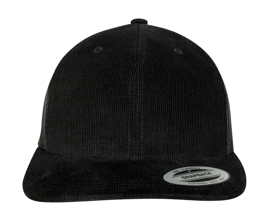 ·100% Cotton (Corduroy) ·Mesh panels: 100% Polyester ·6 panels ·Flat peak with 8 rows of stitching ·Matching undervisor ·Snapback closure.