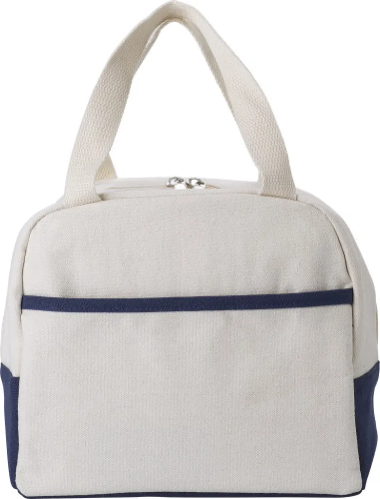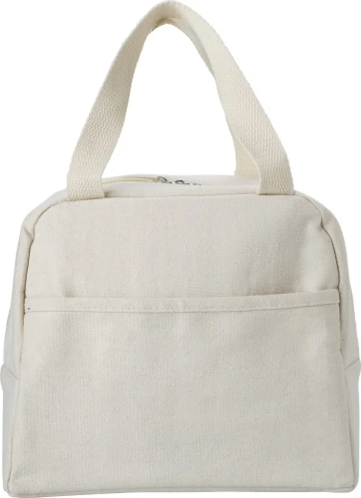 Cotton (280 gr/m²) cooler bag with PEVA lining. One large compartment with zipper, one small front pocket.