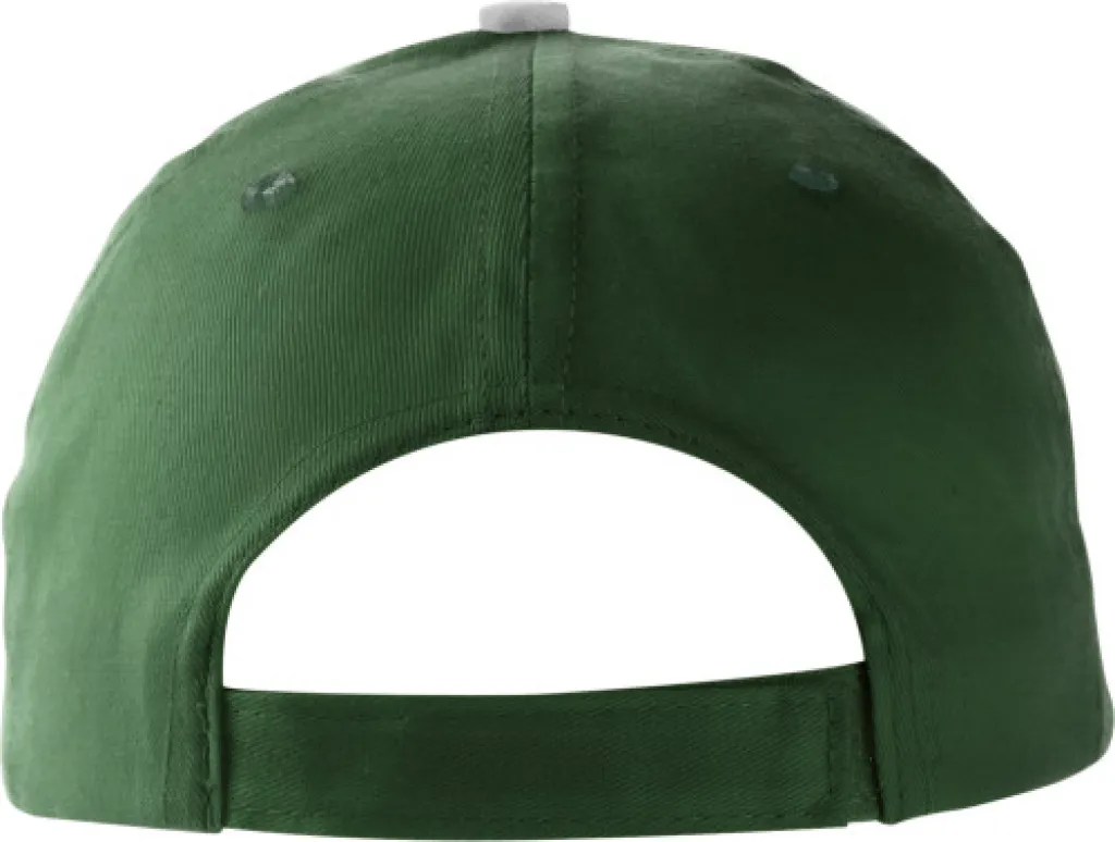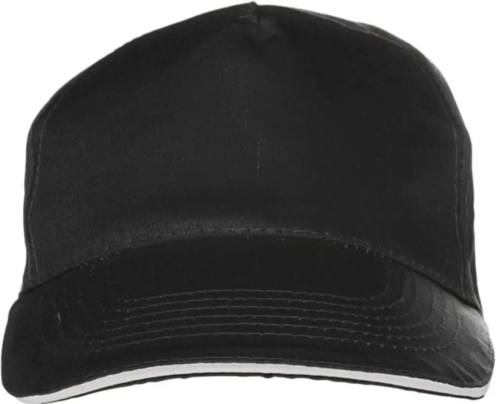 100% Cotton cap with five panels, sandwich peak, and a Velcro fastening.