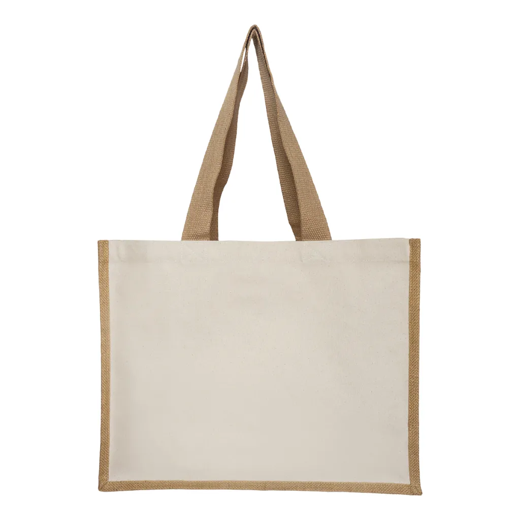 Shopping bag with long handles, made of cotton 280 g/m2 and jute. Wedge width 15,5 cm.