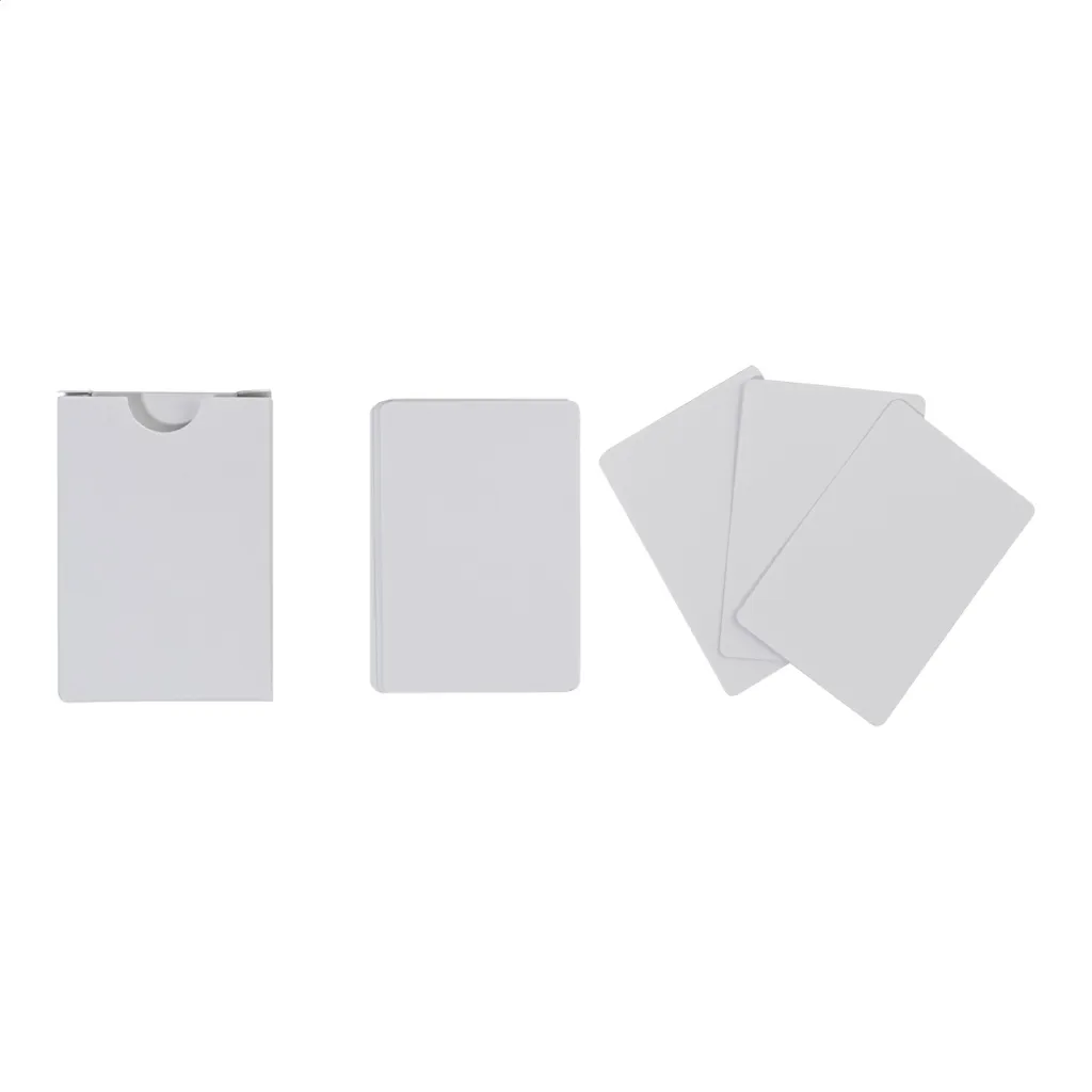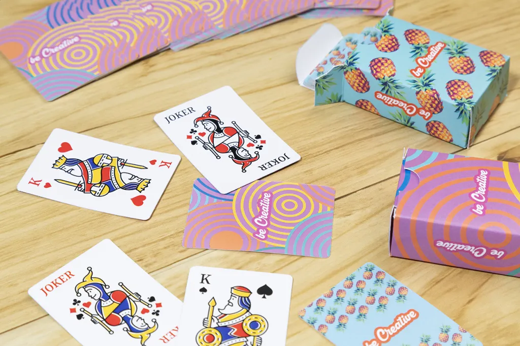 Custom made, mini travel size classic playing cards in paper box. One standard deck with 54 cards. Price includes full colour printed box and an identical full colour print on the back side of each card. MOQ: 100 pcs.