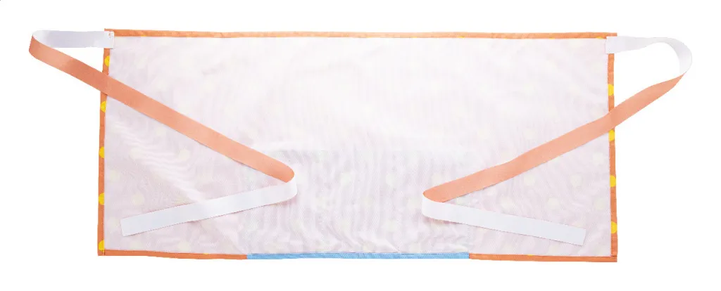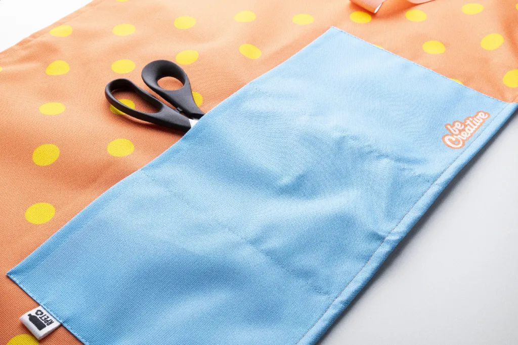 Custom made, 600D RPET polyester bistro apron with triple front pocket and all over sublimation printed graphics and distinctive RPET label. MOQ: 25 pcs.