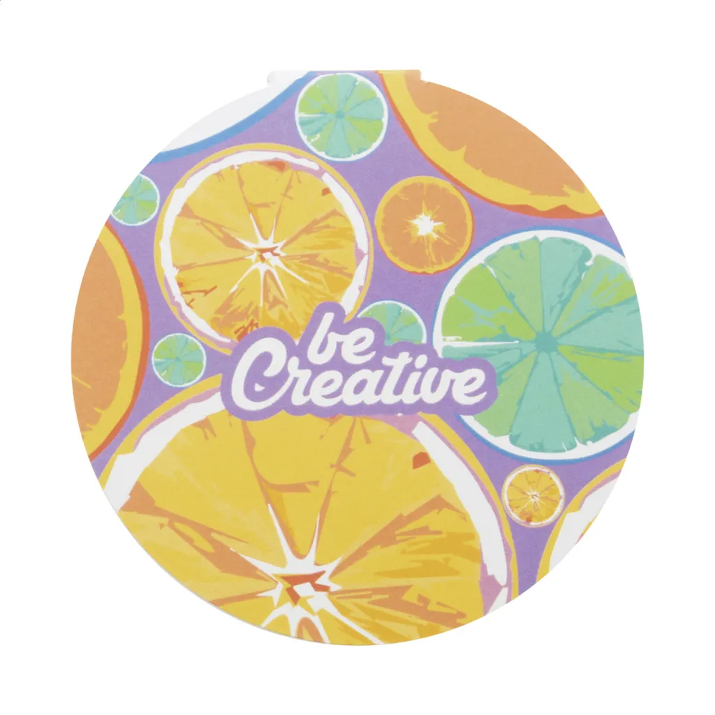 Custom made, paper covered round shaped sticky notepad. Includes 50 sheets of recycled paper sticky notes. Price includes full colour printed outside cover. MOQ: 100 pcs.