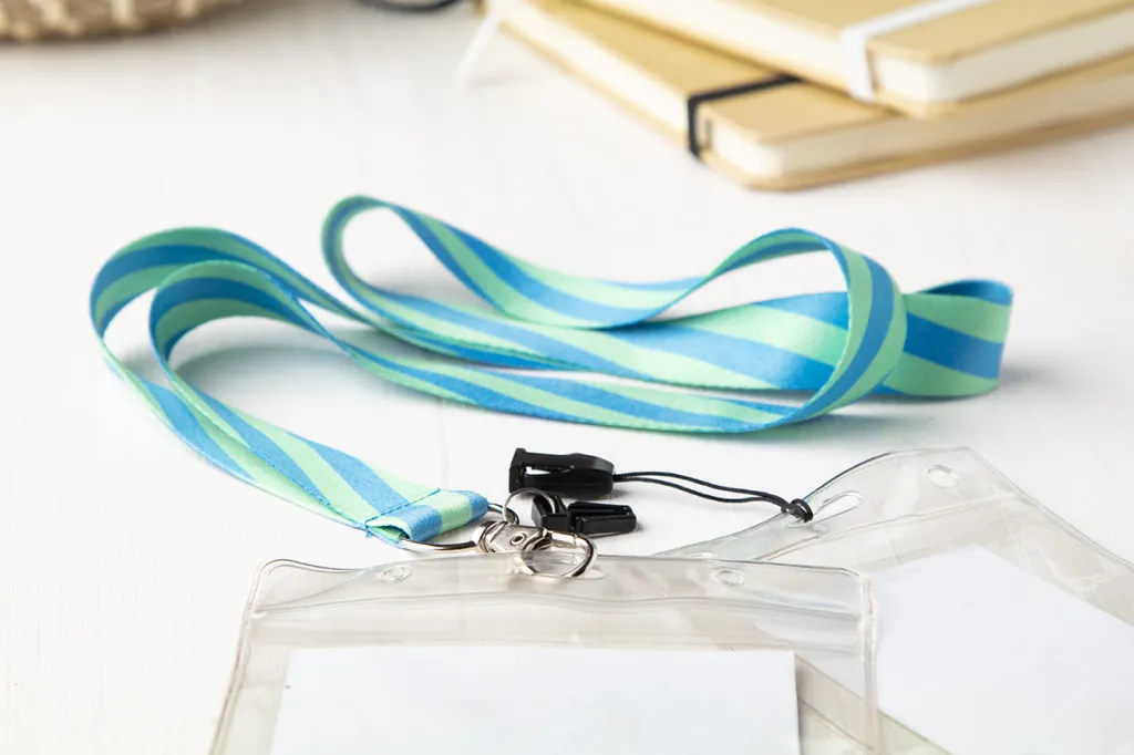 Custom made, polyester lanyard with metal carabiner and mobile string. With sublimation printed graphics on both sides. MOQ: 100 pcs.