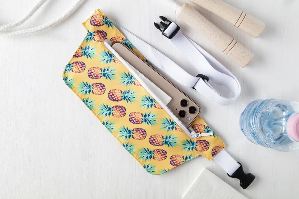 Custom made running belt waist bag in polyester. With zipped compartment and adjustable elastic waistband. With all over sublimation printed graphics. MOQ: 50 pcs.