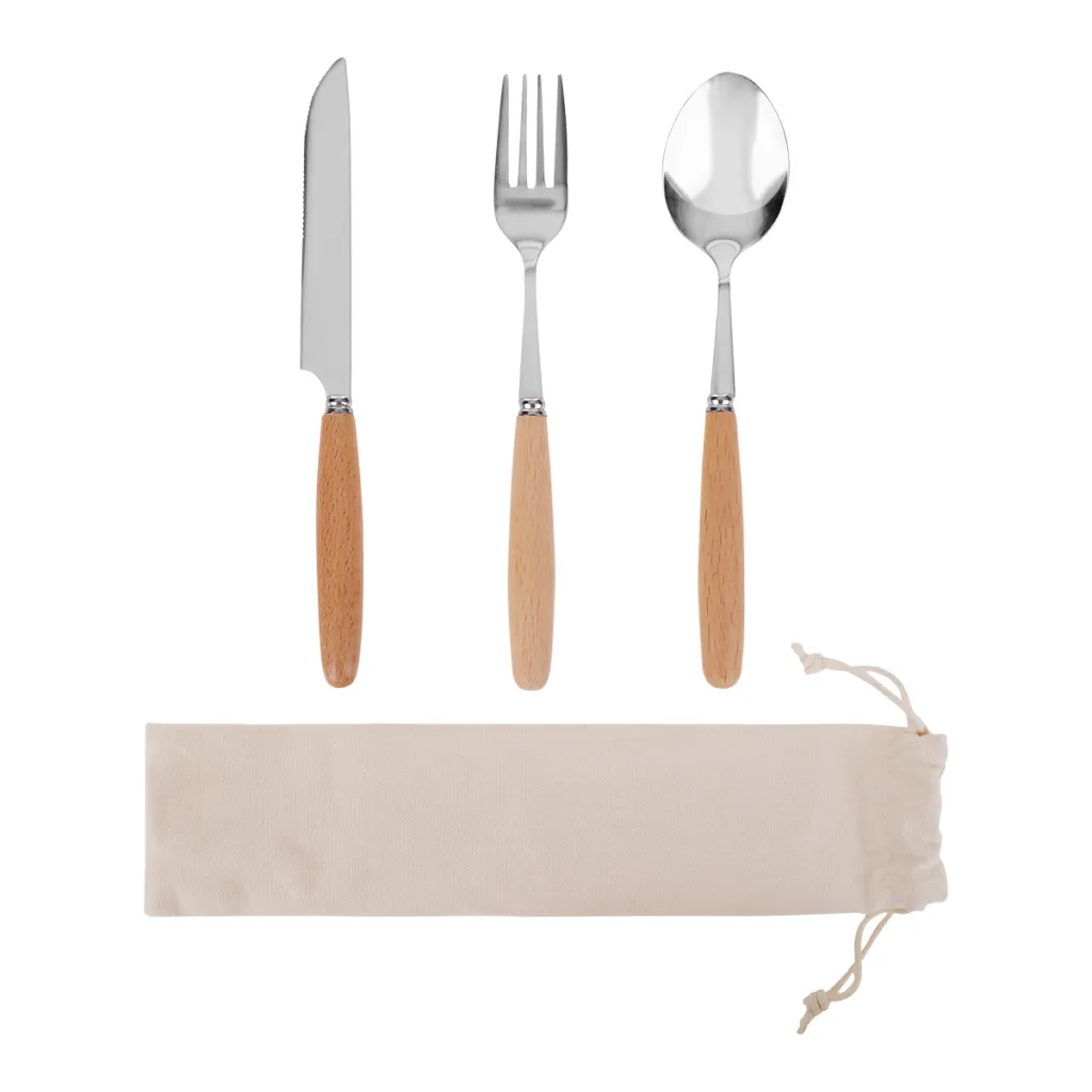 Stainless steel cutlery set with a bamboo handles. Packed in a cotton bag.