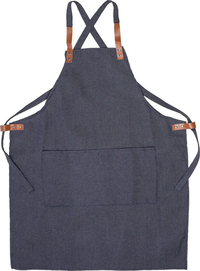 Denim (280 gsm) apron with shoulder straps and two front pockets. The denim is made from 65% polyester and 35% cotton. This apron does not have a neck strap, only shoulder straps. Denim color fastness is up to 2-3 levels. Individually packaged in a brown cardboard gift box.