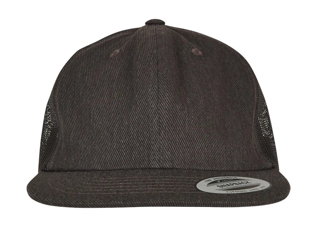 ·245 g/m² ·100% Cotton ·Mesh panels: 100% Polyester ·Front panels and peak looks like denim ·6 panels ·Flat peak with 6 rows of stitching ·Matching undervisor ·Snapback closure.