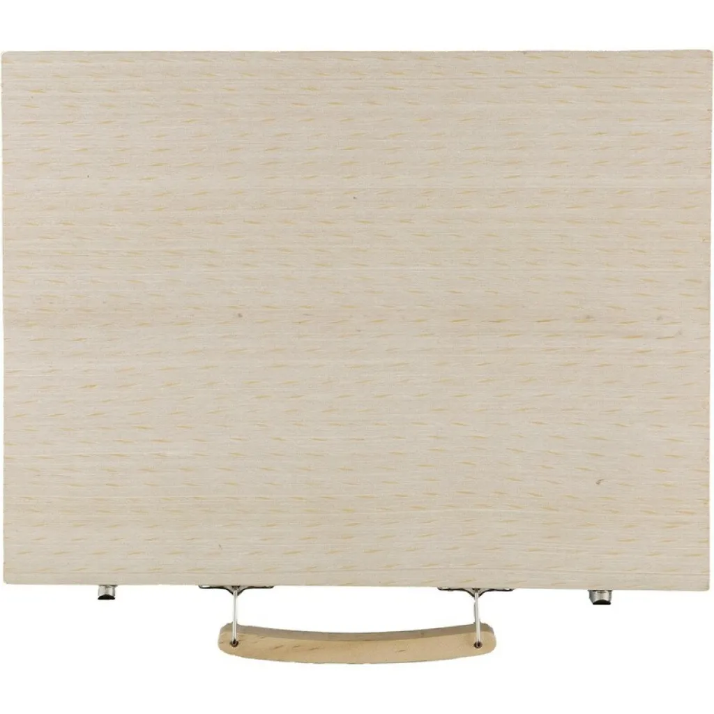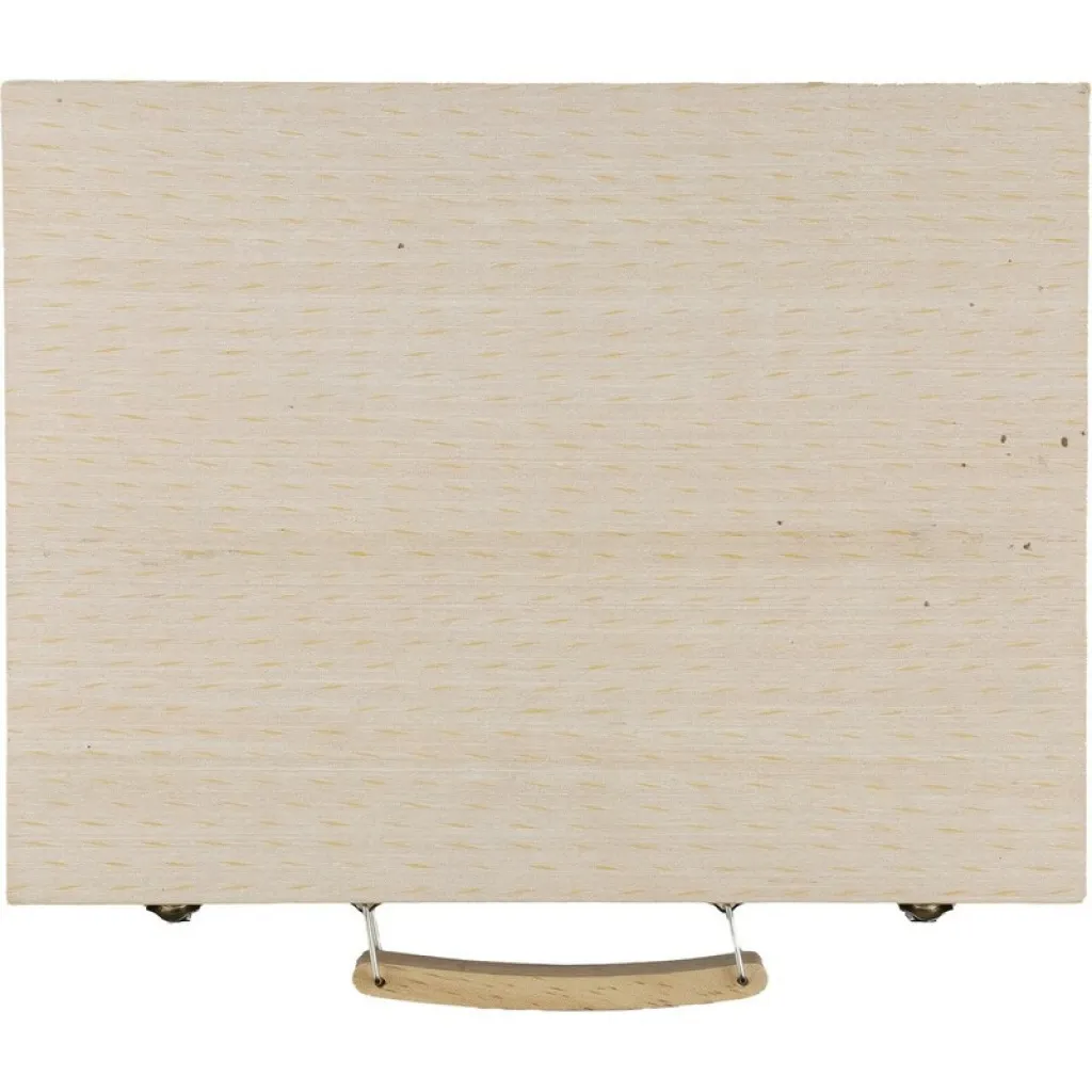 Drawing set with a plywood pine wooden case and wooden handle, containing 66 pieces: 12 wax crayons, 12 colour pencils (sharpened), 12 felt-tip pens, 12 oil crayons, a glue stick, eraser, pencil sharpener, ruler, brush, 12 paints, a palette, packed individually in a brown carton box